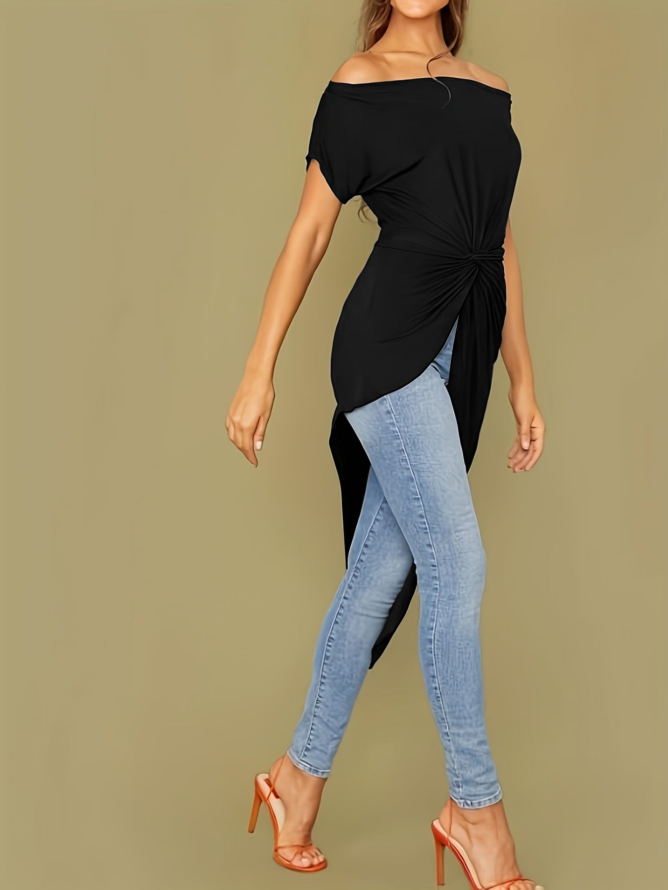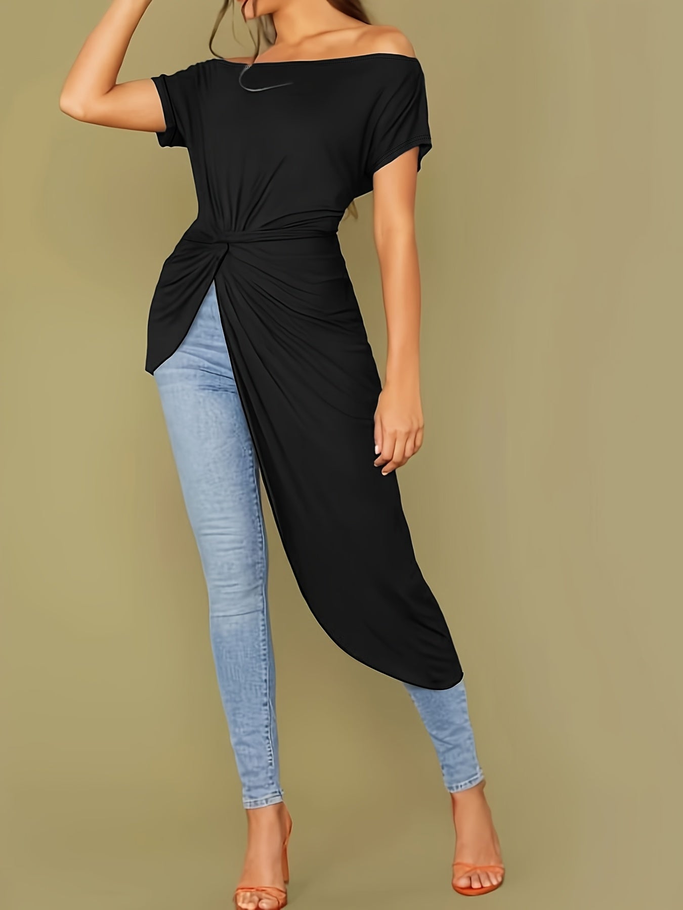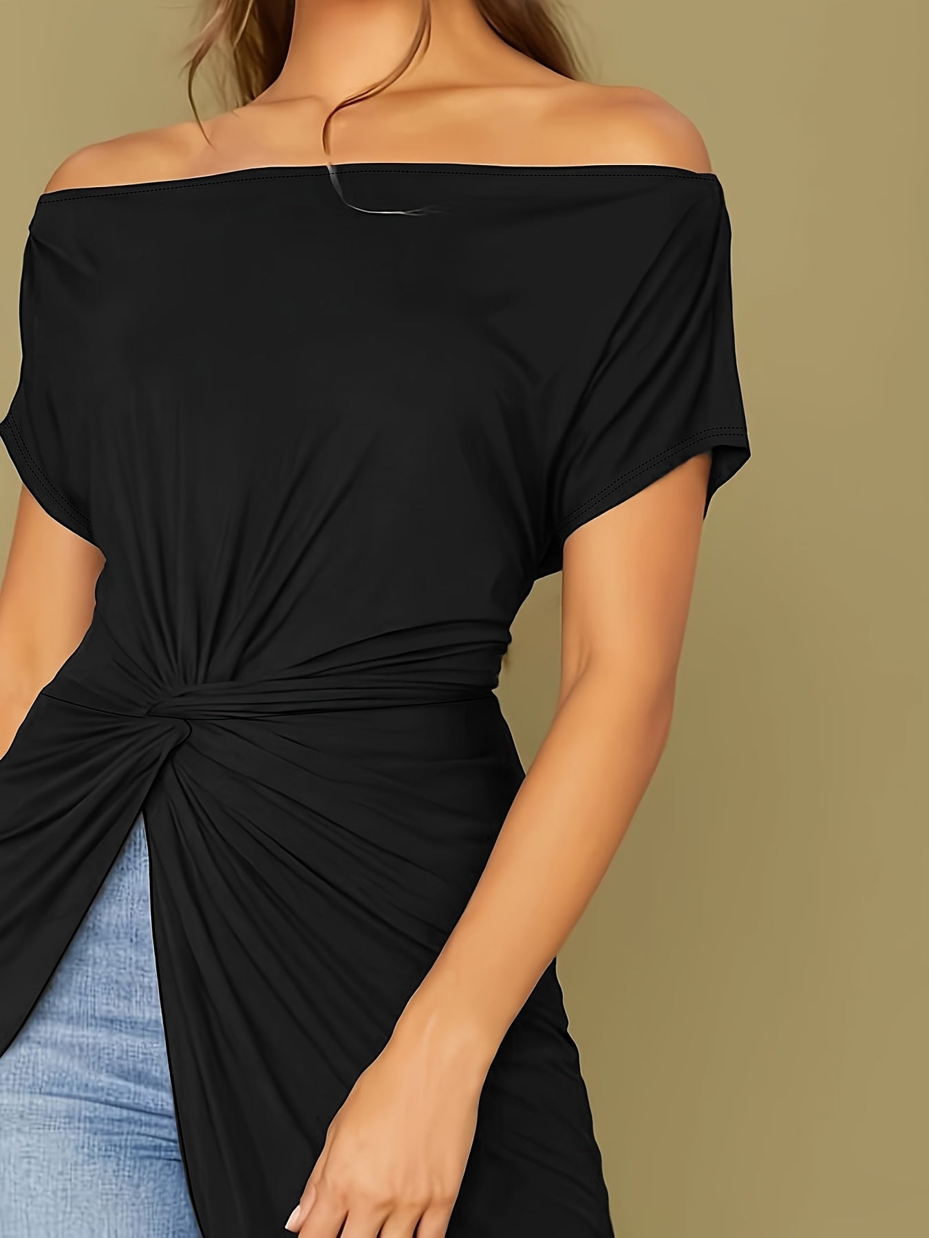Elevate your casual wardrobe with this versatile off-shoulder top, perfect for pairing with jeans or shorts for a laid-back yet stylish outfit. Its unique twist detail and fashionable asymmetrical hem ensure you'll stand out this summer. Don't miss out on this essential piece that combines elegance with ease!
