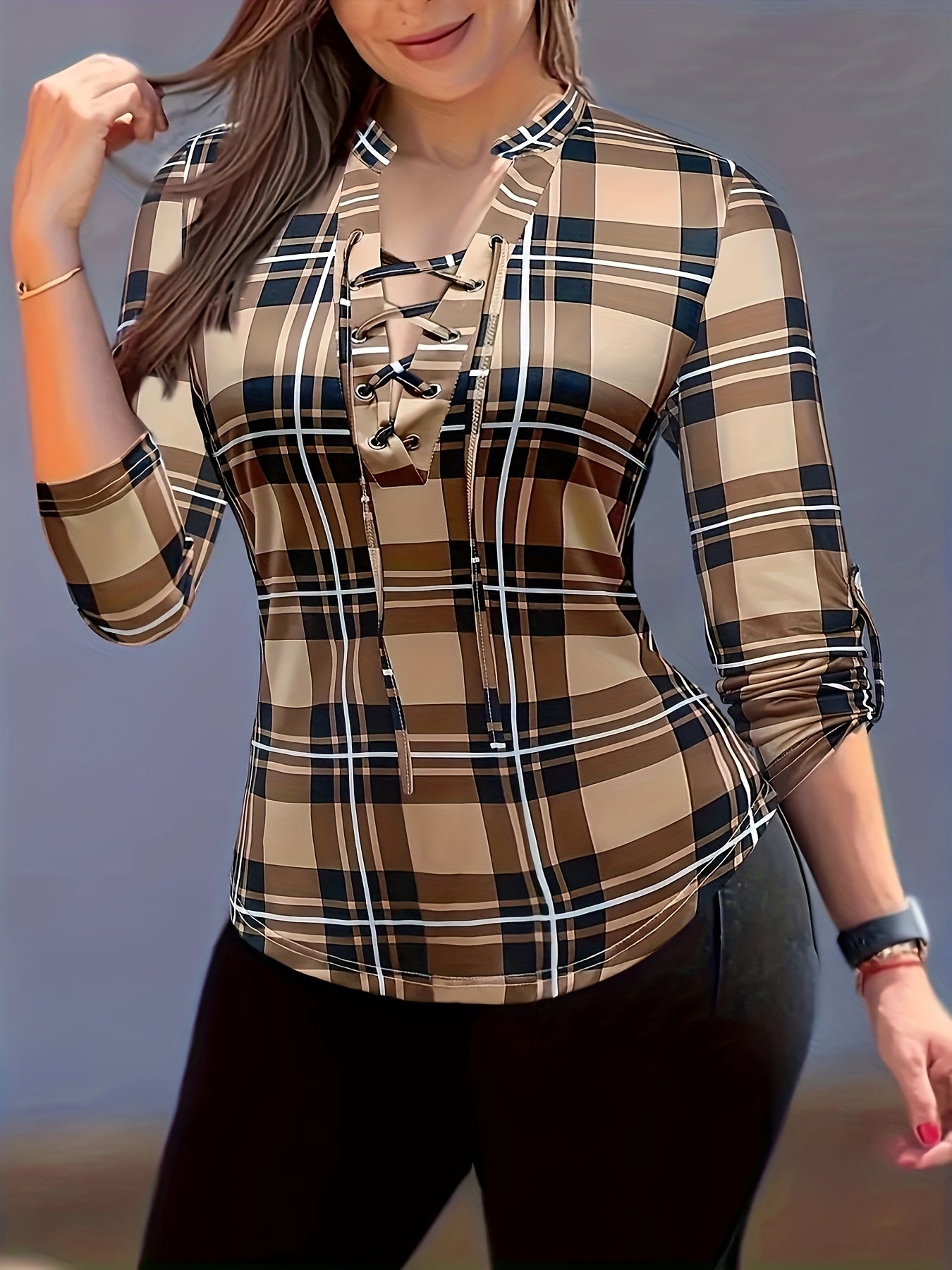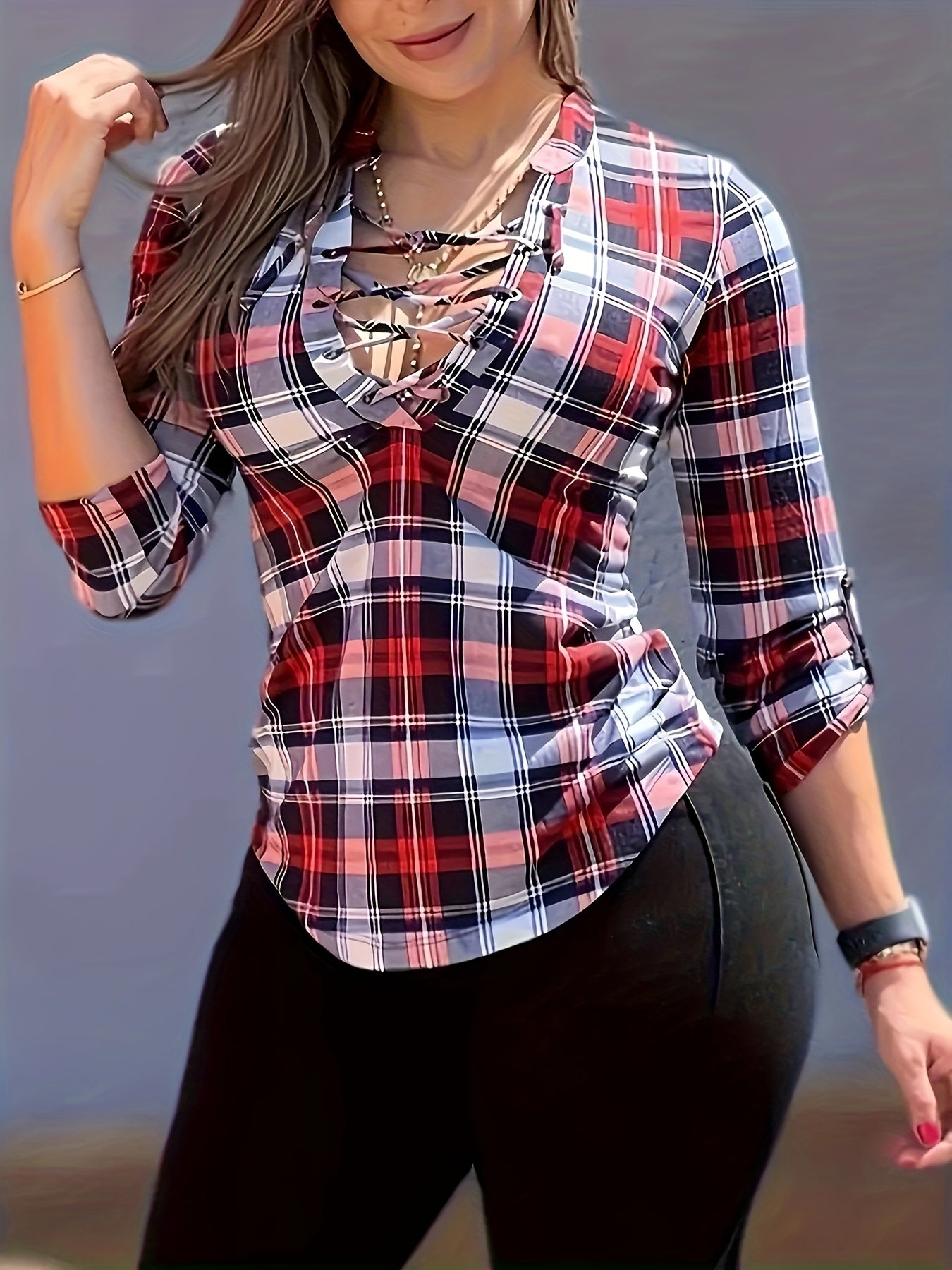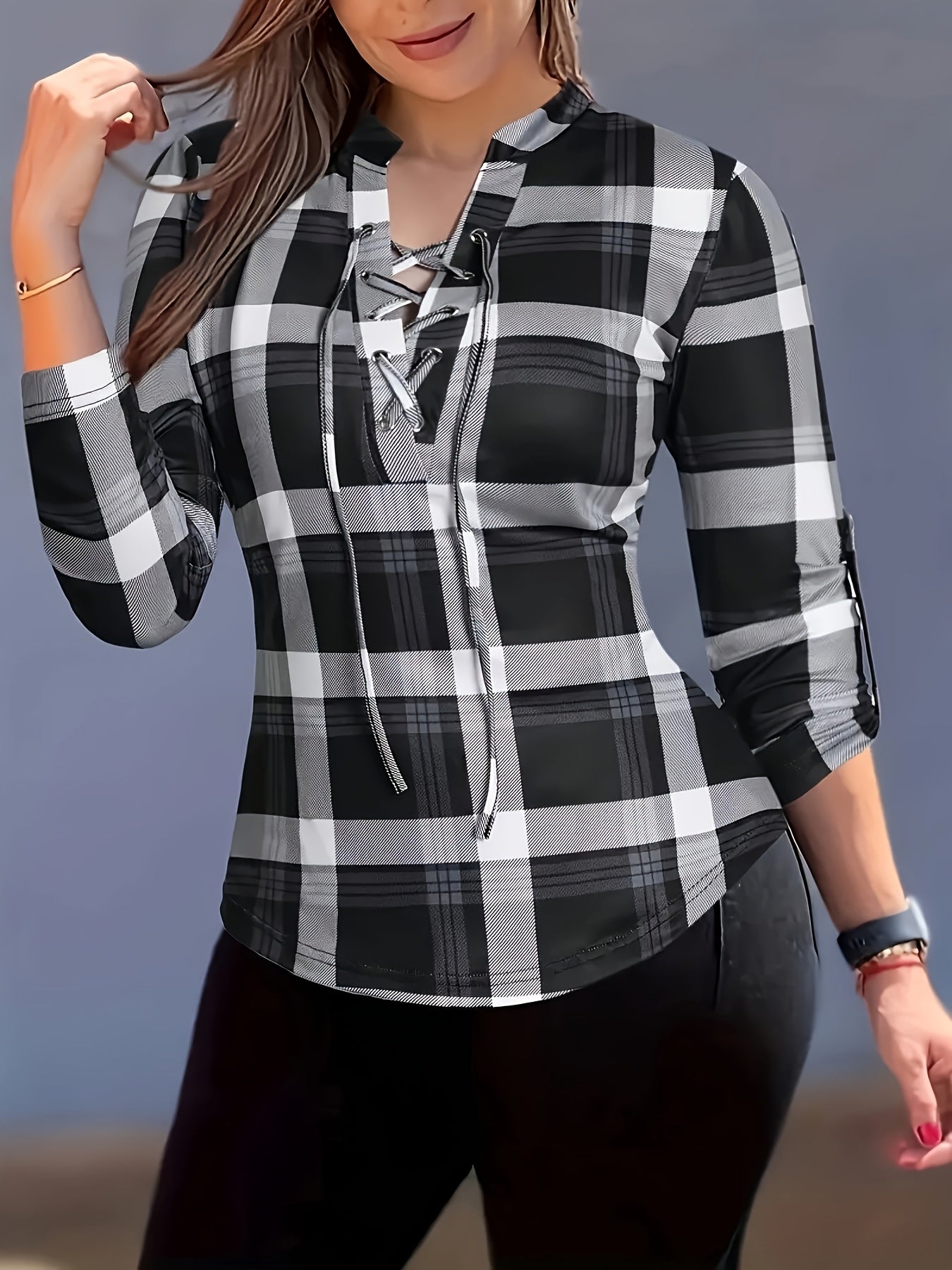 Elegant Women's Plaid T-Shirt - Long Sleeve, Crisscross Detail