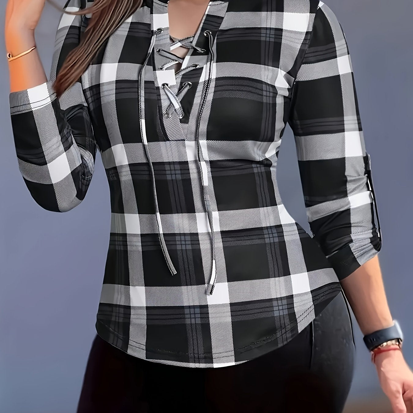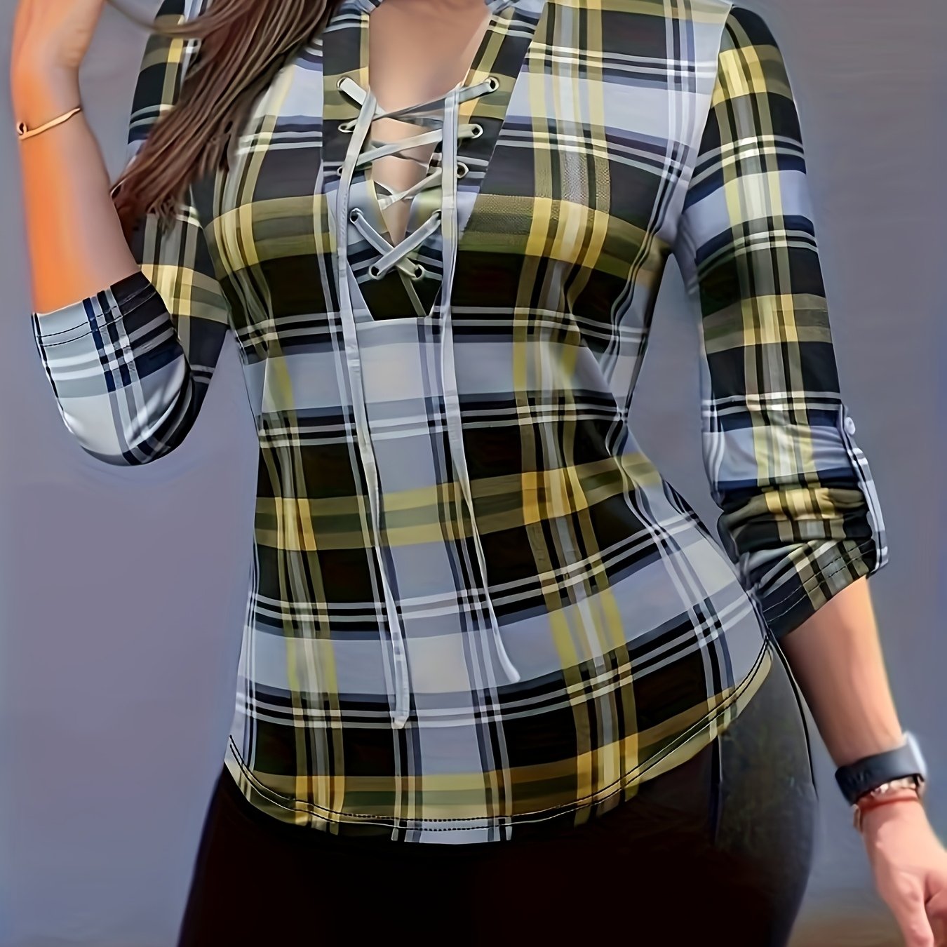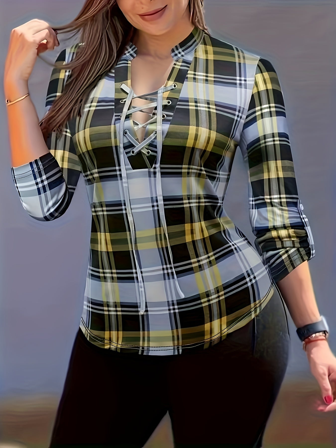 Elegant Women's Plaid T-Shirt - Long Sleeve, Crisscross Detail