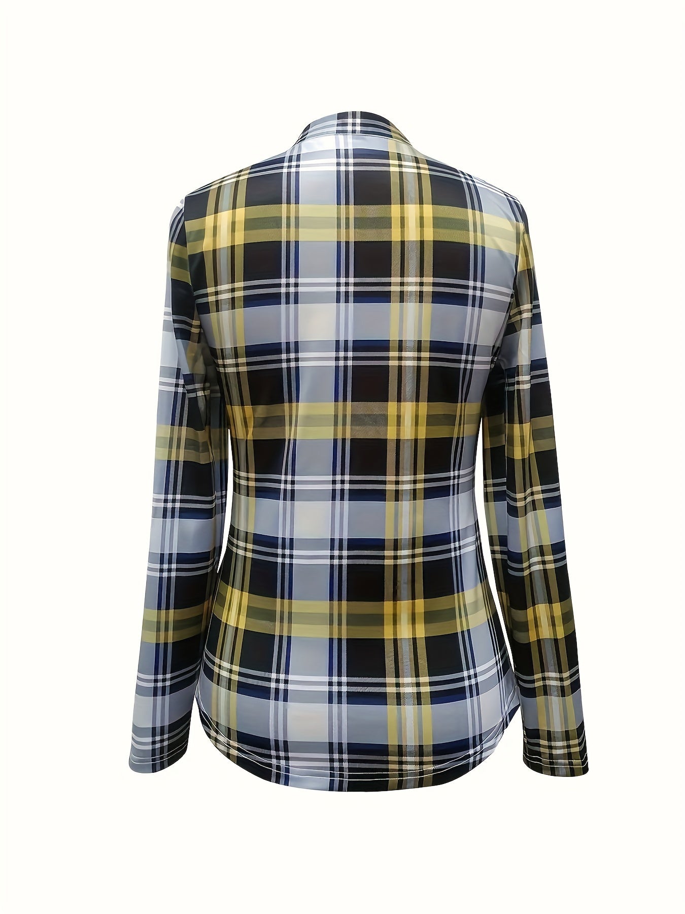 Discover the perfect blend of style and comfort with our Elegant Women's Plaid T-Shirt featuring crisscross detail. Made primarily from a durable polyester blend, this long-sleeve shirt is machine washable and designed for seamless transition through spring, summer, and fall. Its chic plaid pattern and elegant mandarin collar make it a versatile addition to any wardrobe.