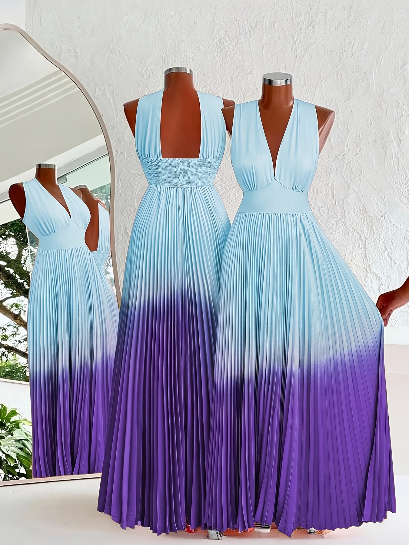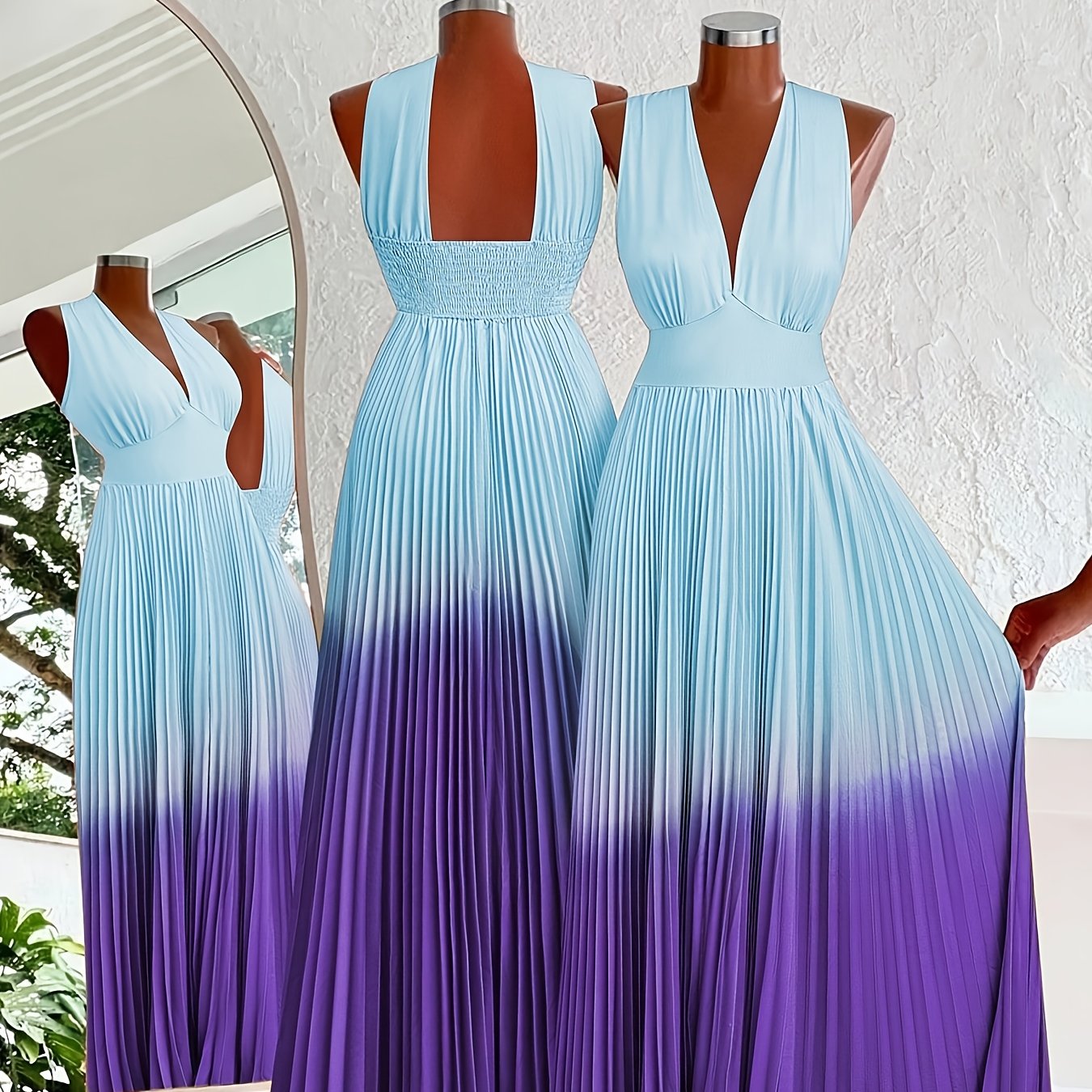 Introducing the Women's Elegant Gradient Purple to Pink Dress, a stunning addition to your wardrobe for both formal and casual occasions. This A-Line party dress features a smooth, non-stretchy fabric that ensures comfort while maintaining elegance. It's designed with a flattering V-neck and is machine washable, making it the perfect choice for summer outings.