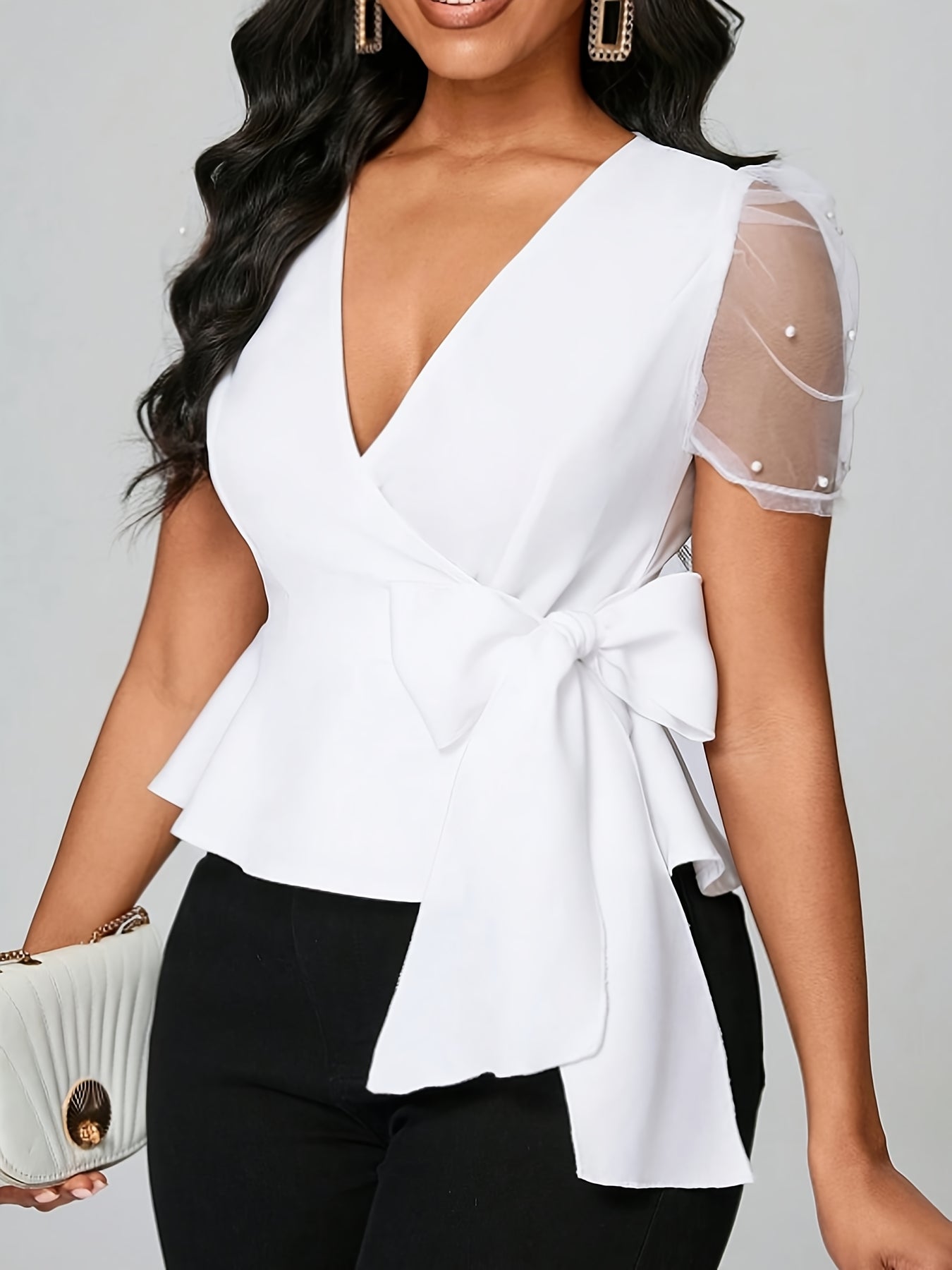 Discover the perfect blend of style and comfort with our Women's Elegant Pearl Net Sleeve Blouse. This chic blouse can be paired with your favorite jeans or a stylish skirt, making it an essential addition to any modern woman's wardrobe. Embrace elegance and versatility this summer with this must-have top!