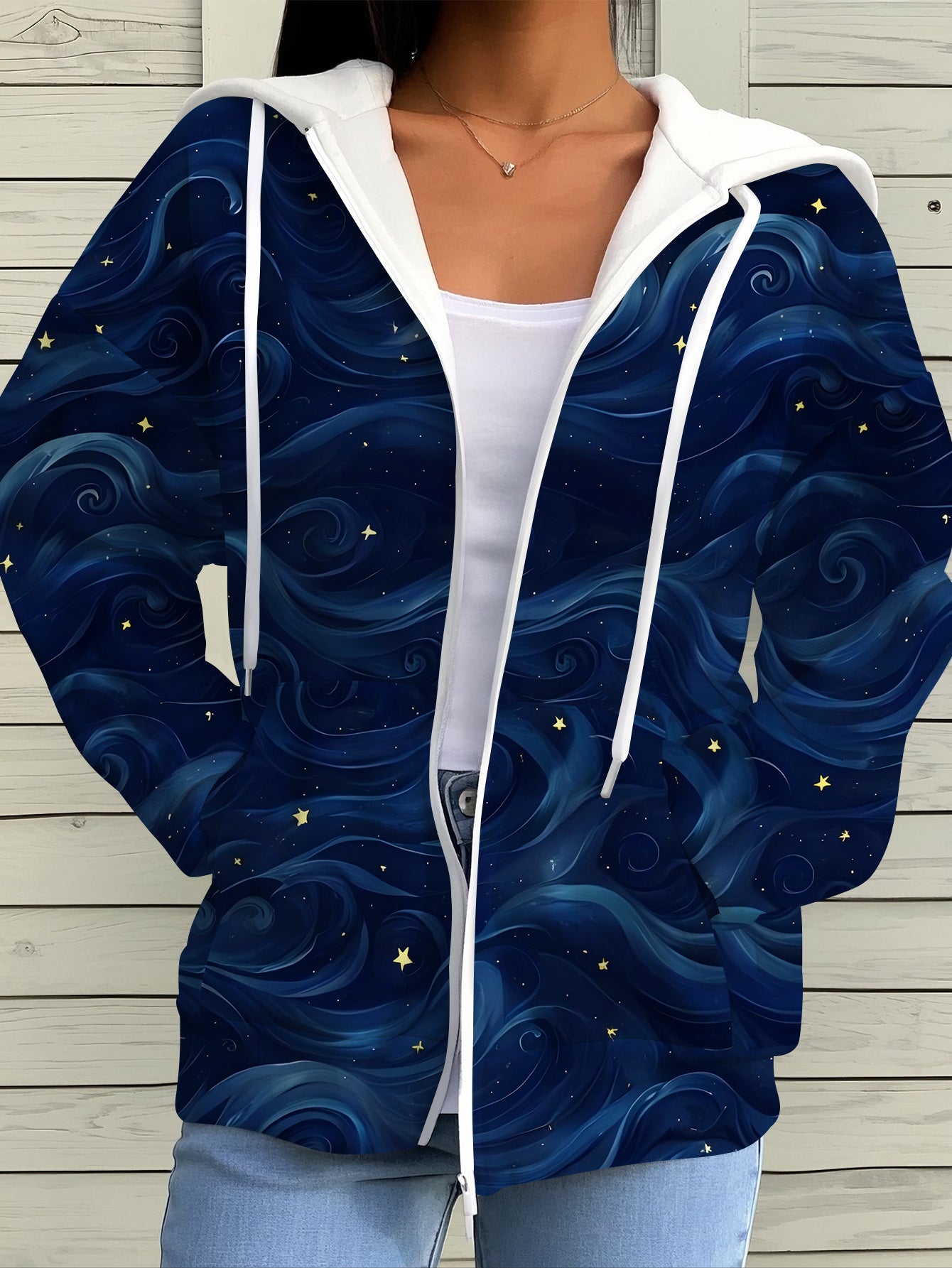 Women's Navy Zip-Up Hooded Jacket - Starry Night Print, Fall Wear