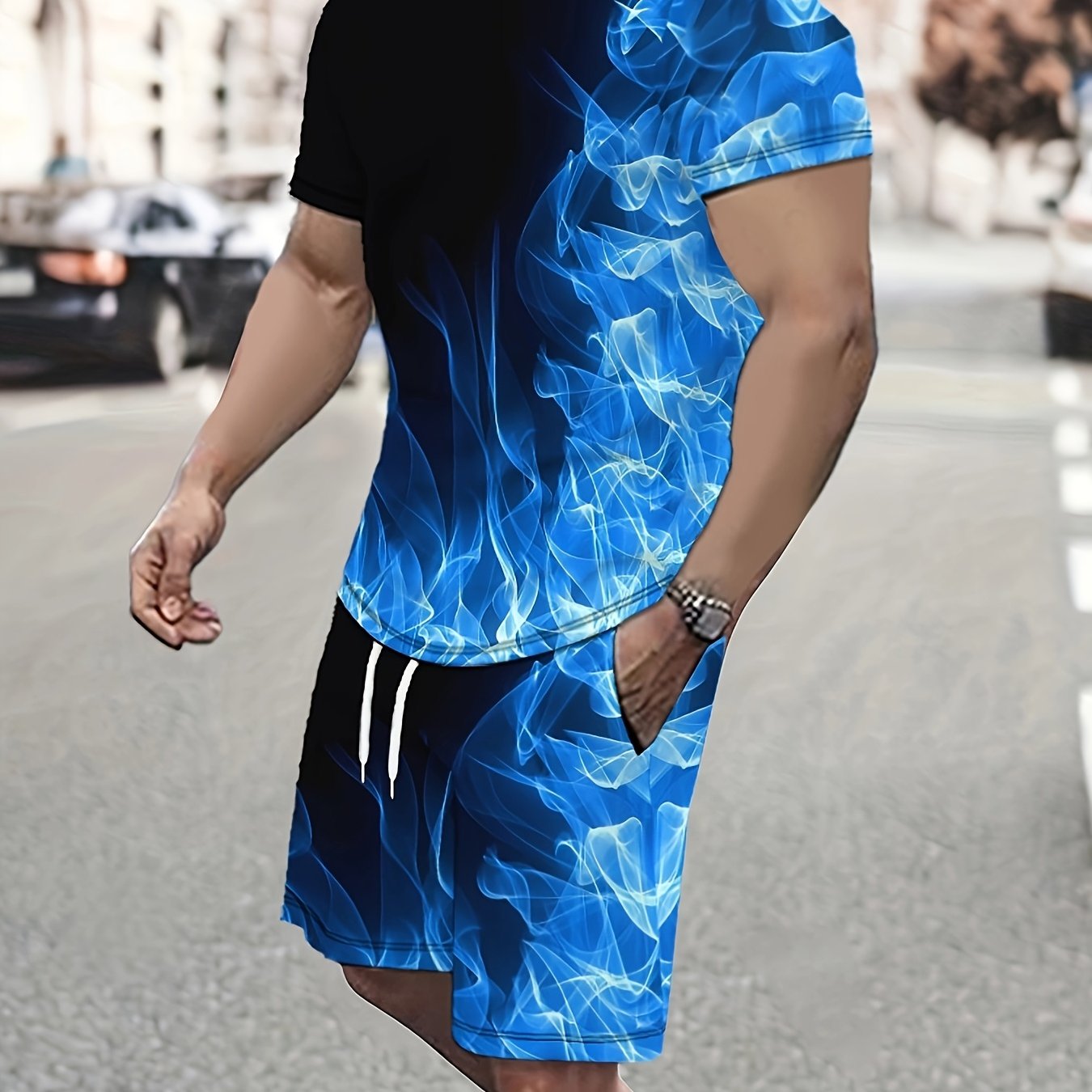 Discover the ultimate comfort and style with our Men's Stylish Casual Sportswear Set, featuring a striking Blue Flame High-Definition Pattern. This combination of a short-sleeve t-shirt and drawstring sports shorts is perfect for summer outdoor training or casual wear, making you stand out in the Middle East.