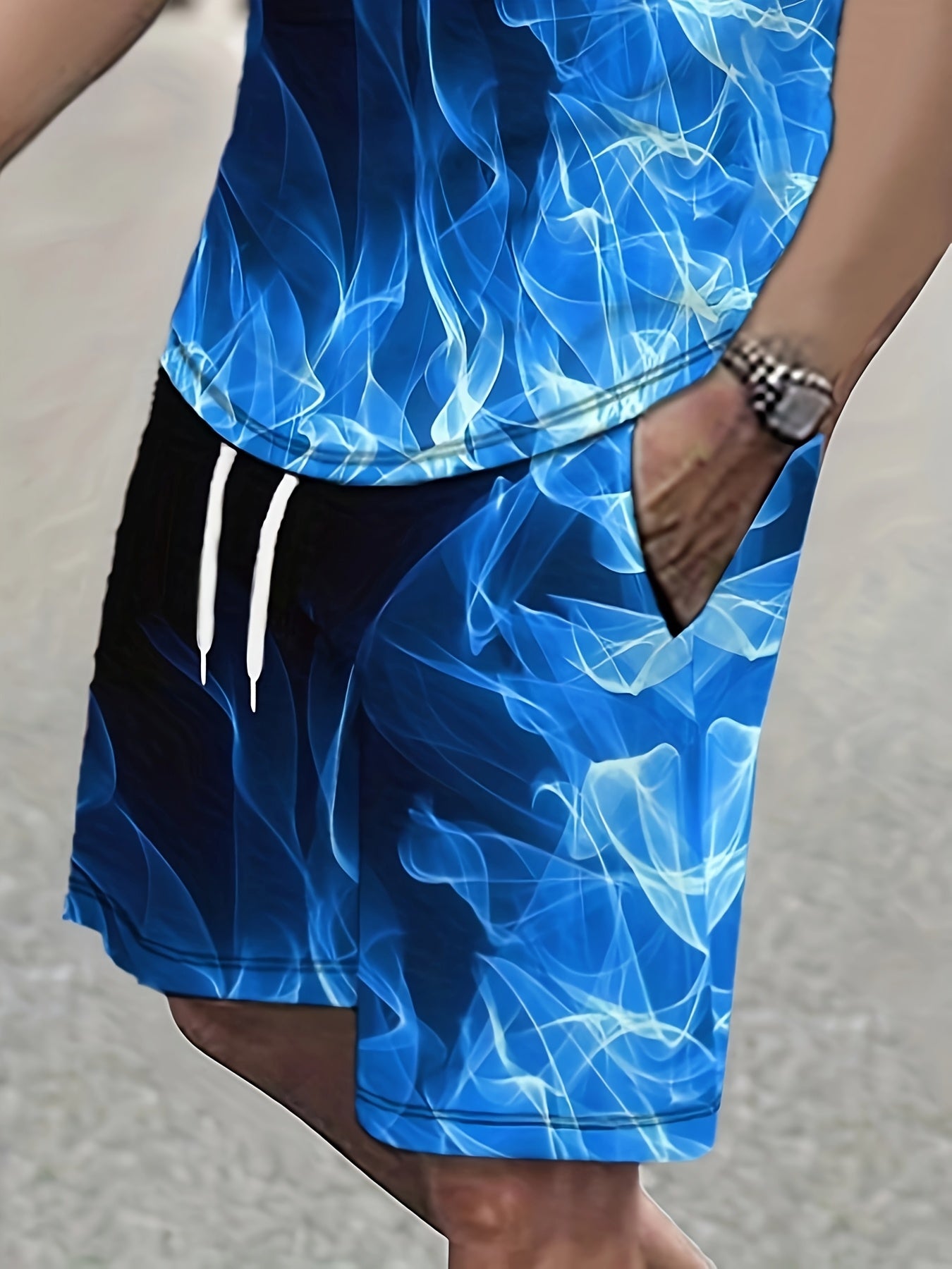 Men's Casual Sportswear Set - Blue Flame T-Shirt & Drawstring Shorts