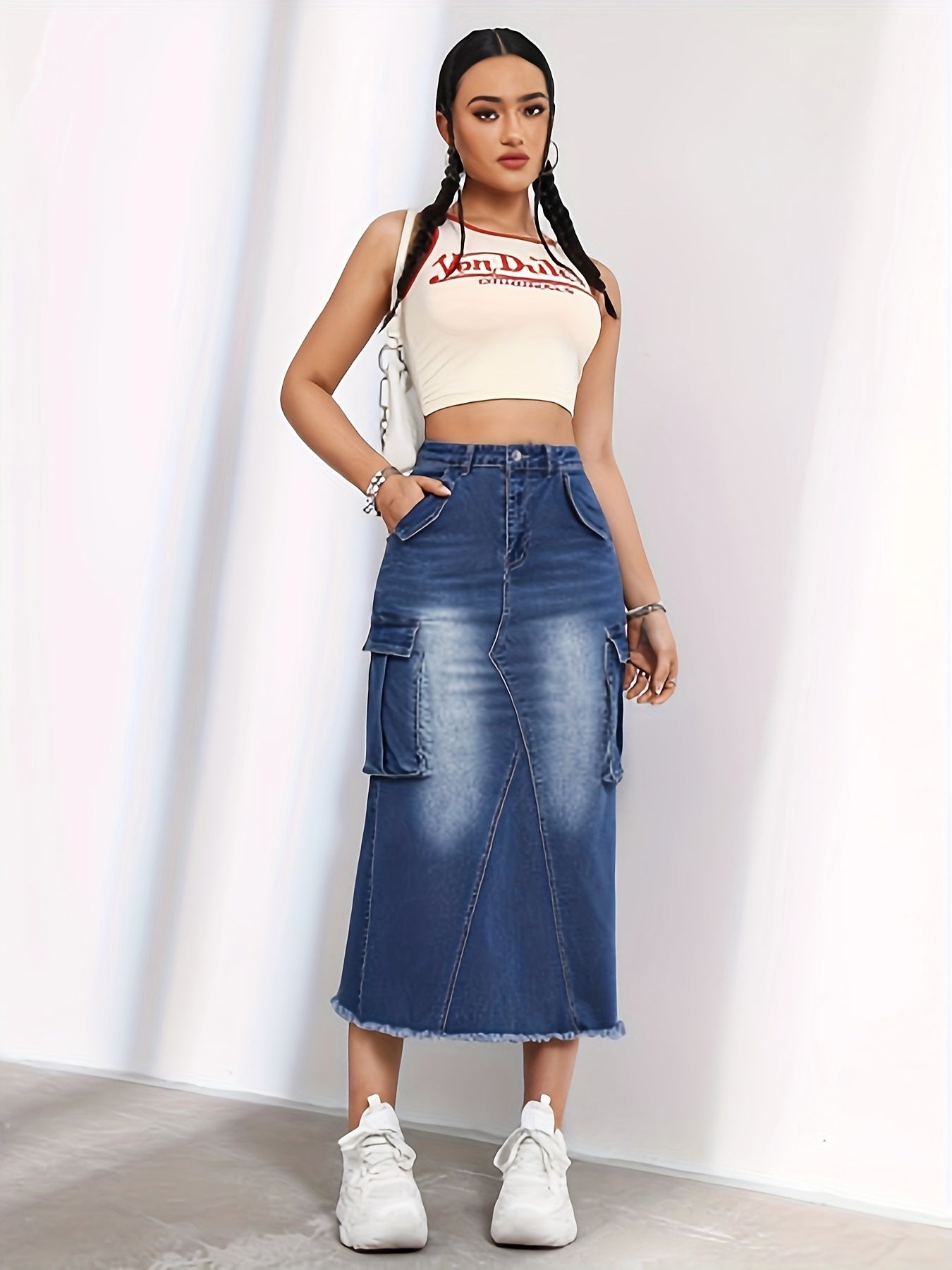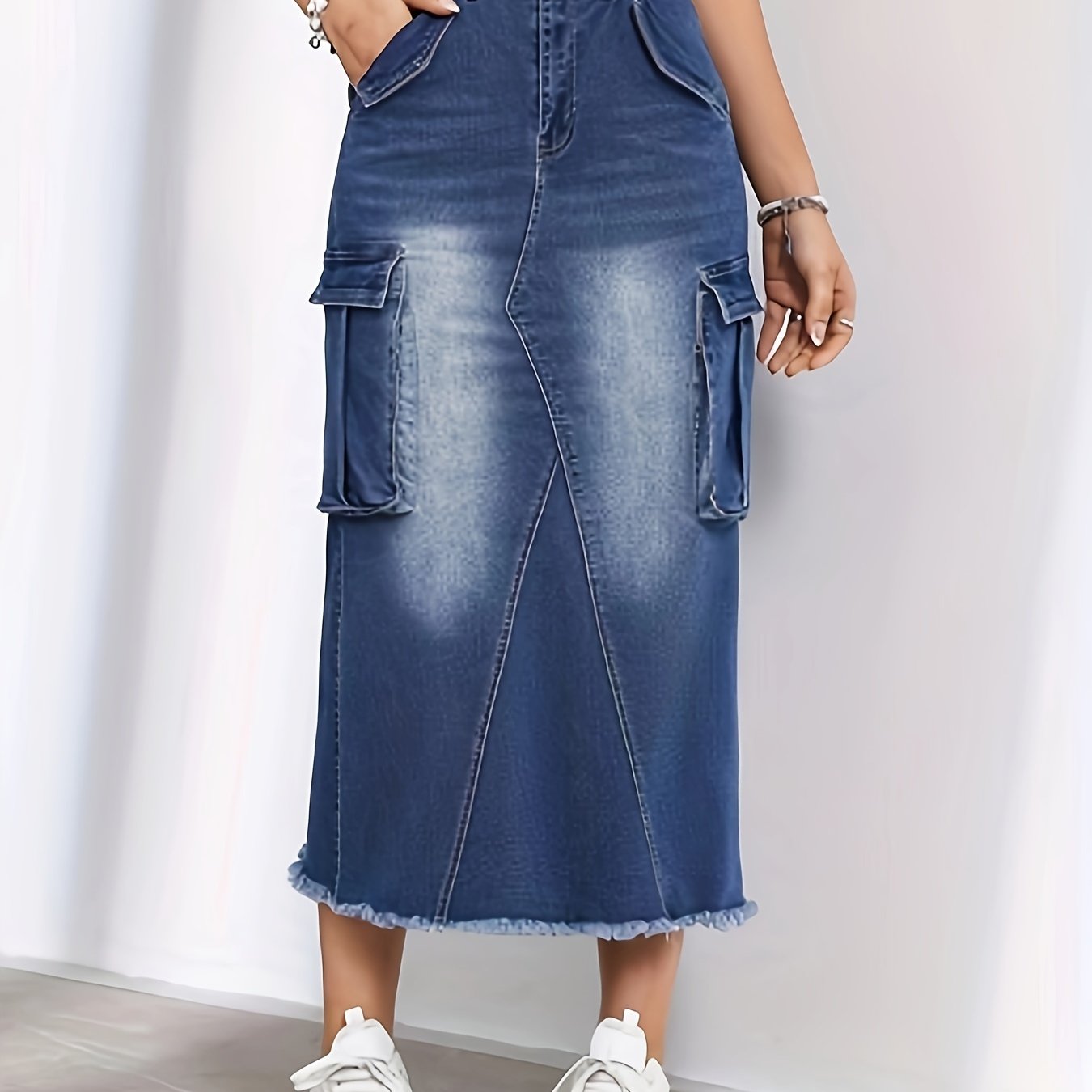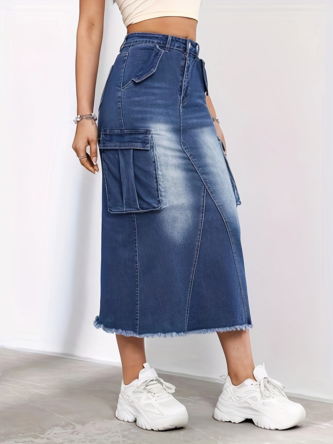 Discover the perfect blend of comfort and style with our Women's Denim Midi Skirt. This flared fish tail design features an elastic waist for the ultimate fit and convenient pockets, making it a must-have for your spring, summer, or fall wardrobe.