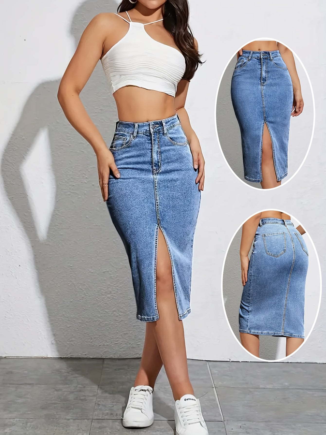 Discover the 2025 High-Waist Denim Midi Skirt, a perfect blend of vintage style and modern comfort. Designed with a flattering high slit and convenient pockets, this skirt is ideal for the fashion-forward individual looking to elevate their wardrobe in any season.