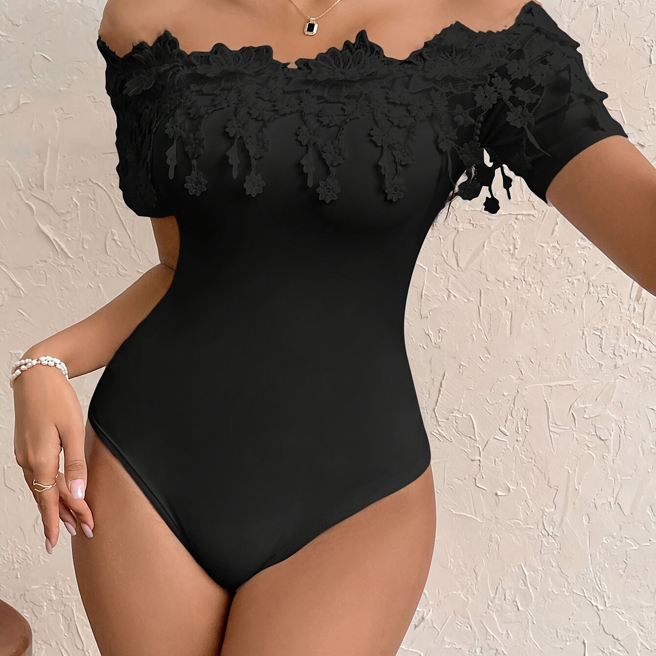 1pc Sexy Sheer Lace Bodysuit - Off-Shoulder, Soft & Stretchy