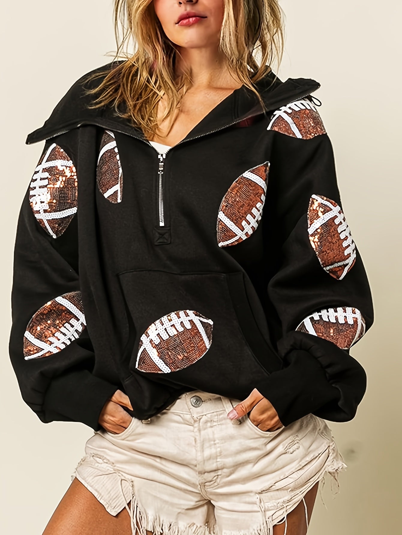 Experience a blend of style and comfort with our Women's Oversized Football Print Hoodie. Its micro elastic fabric ensures a great fit, while the random print adds a trendy touch. Perfect for cozy days out or lounging at home, this hoodie easily pairs with your favorite jeans or leggings, making it a must-have addition to your seasonal wardrobe.