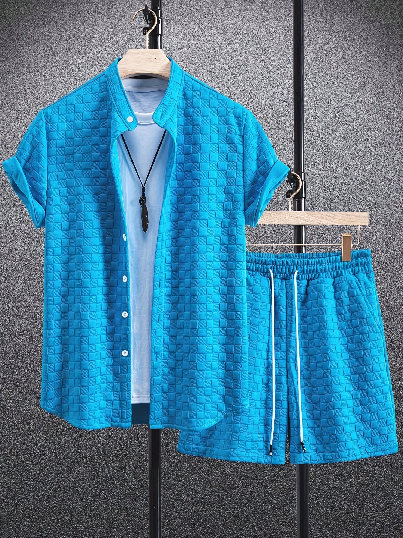 Discover the perfect blend of comfort and style with our Men's Casual Athletic Set, featuring a short sleeve shirt and drawstring shorts. Made from slight stretch polyester, this solid color set is designed for regular fit and is ideal for any casual occasion.
