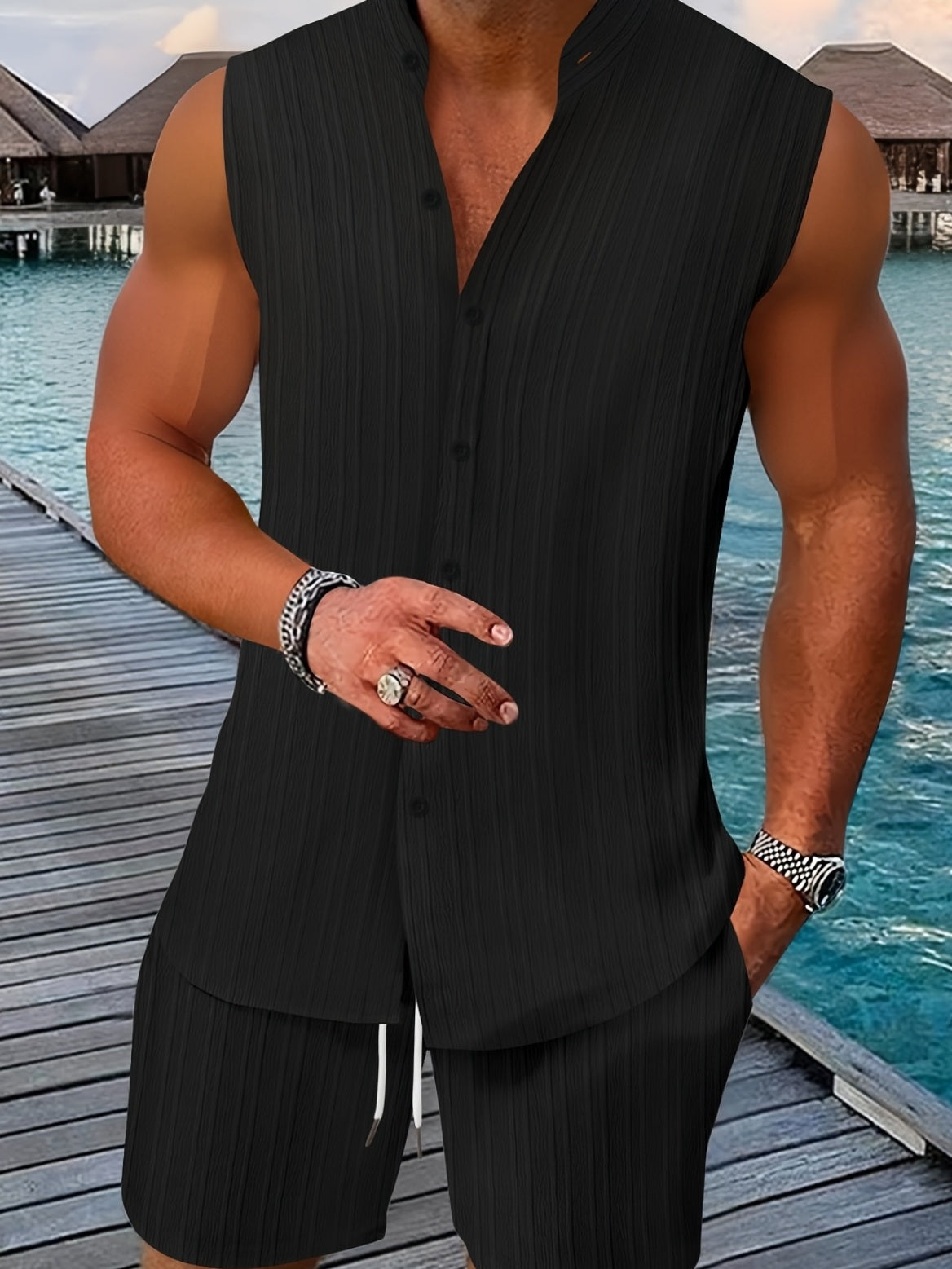 Make a fashion statement this summer with our Men's Casual Sleeveless Henley Shirt & Beach Shorts Set. Designed for the modern man, this set combines comfort with style, ensuring you look and feel confident during all your summer activities. Perfect for beach days, barbecues, or simply lounging around, this versatile outfit will keep you cool and stylish all season long.