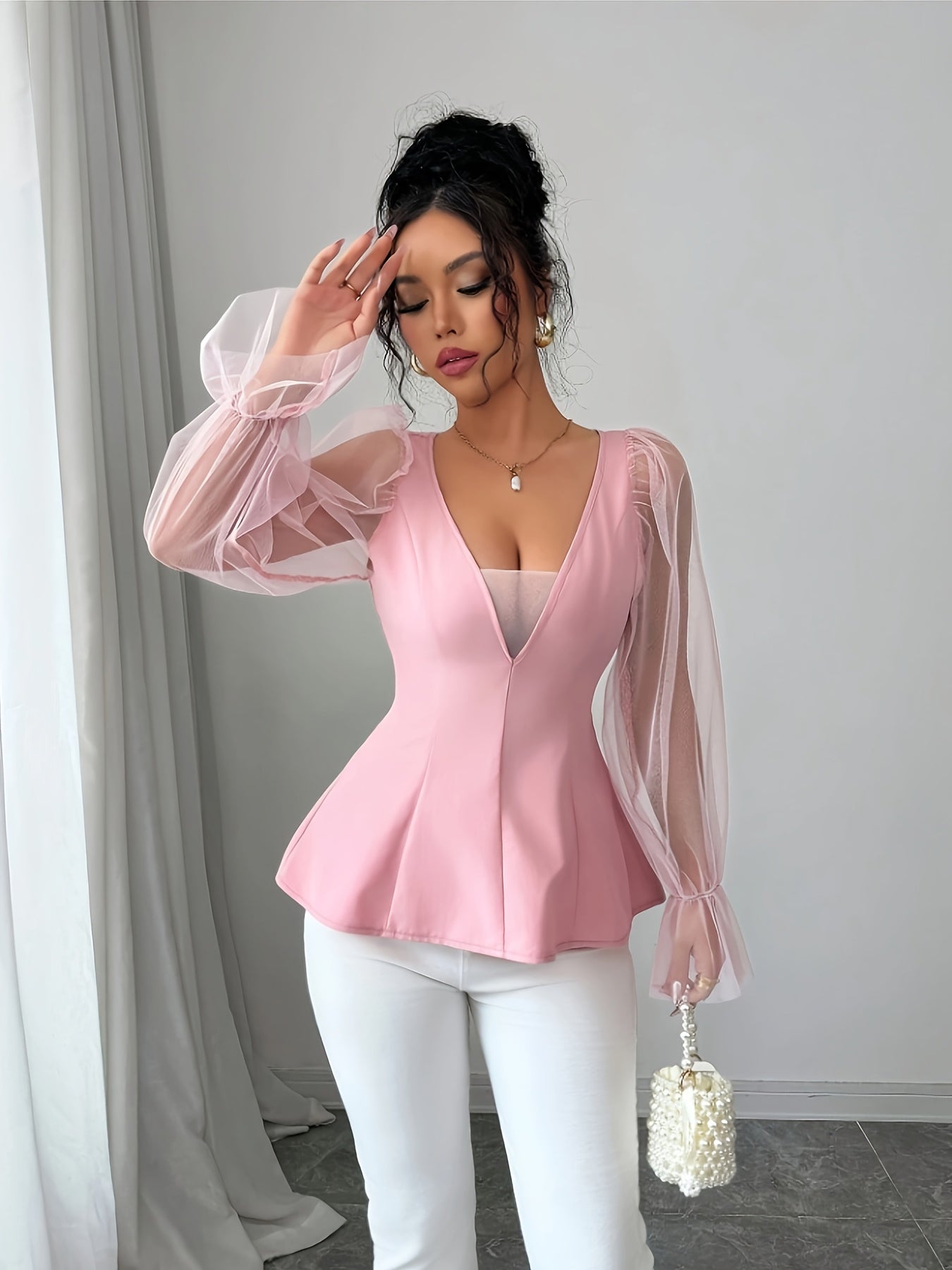 YY0302156 Women's Mesh Casual Top - Elegant V-neck for Spring/Summer