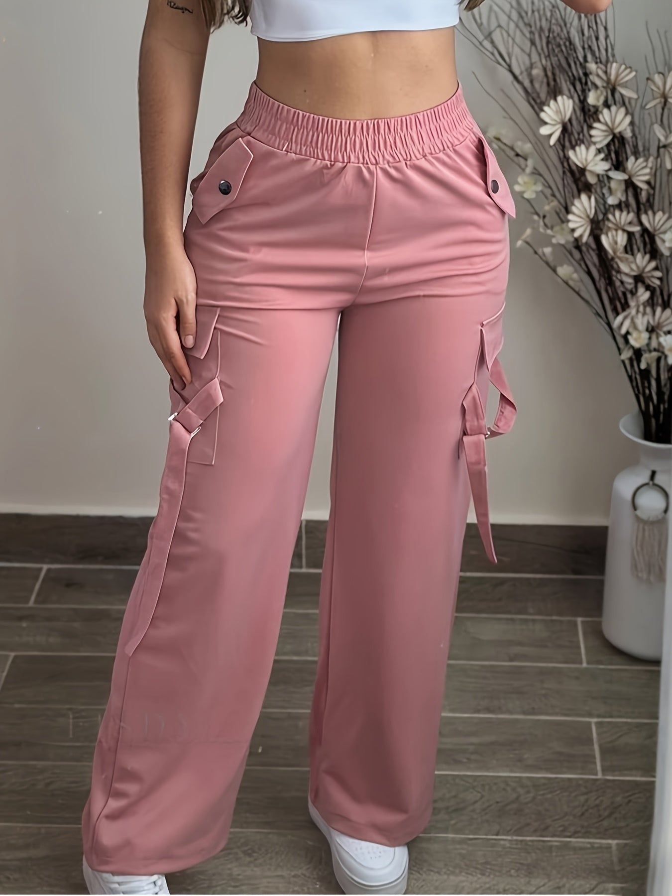 Women's High Waist Cargo Pants - Solid Color, Relaxed Fit, Polyester