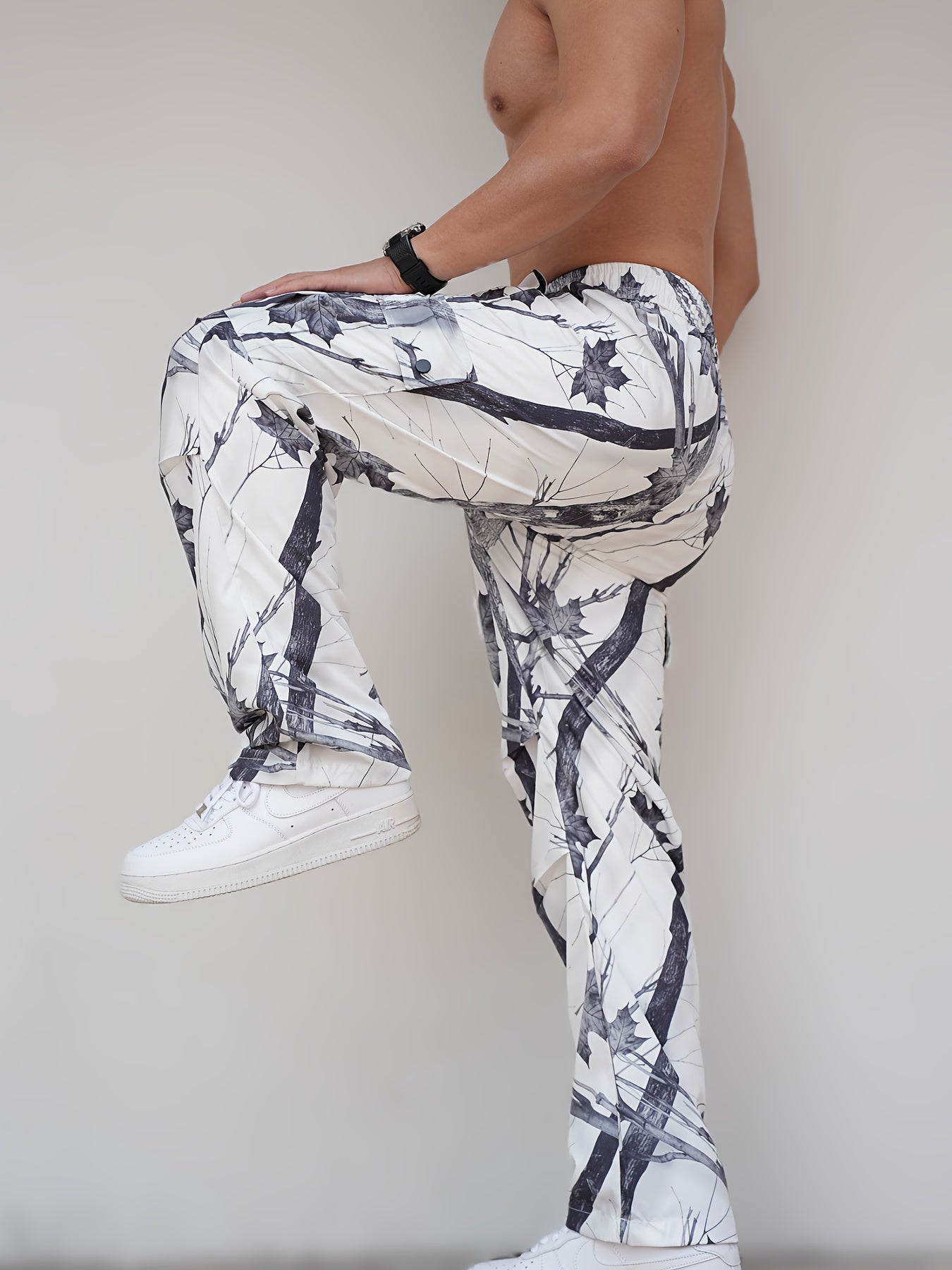 Introducing our Men's Loose Fit Camo Cargo Pants in a stylish black and white design, crafted from 100% polyester. Perfect for casual outings during spring and fall, these pants ensure comfort and versatility while offering a functional camo pattern.