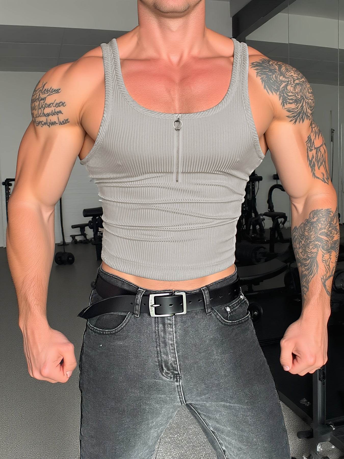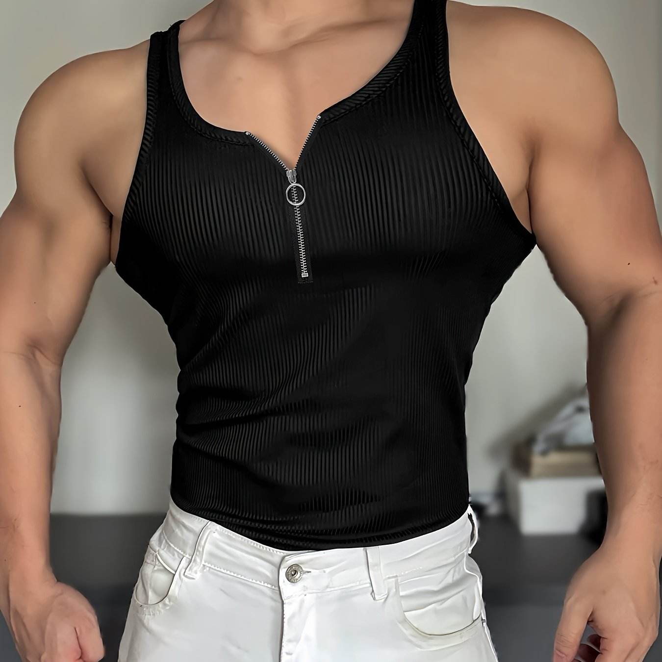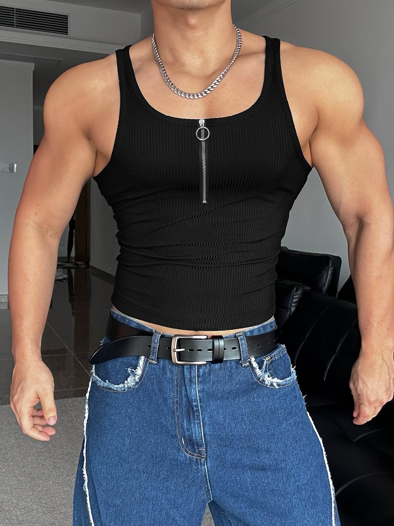 Men's Zip-Up Tank Top - Slim Fit Casual Polyester for All Seasons