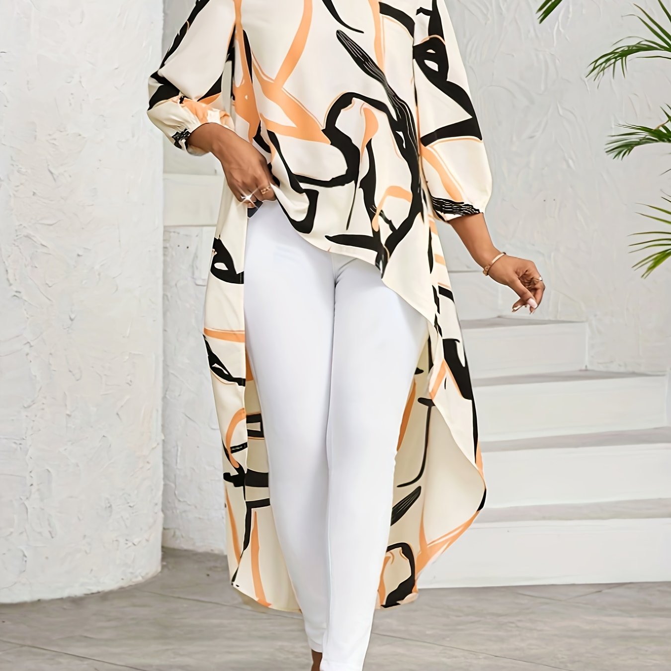 Introducing the Women's Bohemian Longline Tunic Top, a perfect blend of style and comfort for your casual wardrobe. Featuring an asymmetrical hem and three-quarter sleeves, this tunic is made from 100% polyester, ensuring a lightweight and breathable fit for spring, summer, and fall.