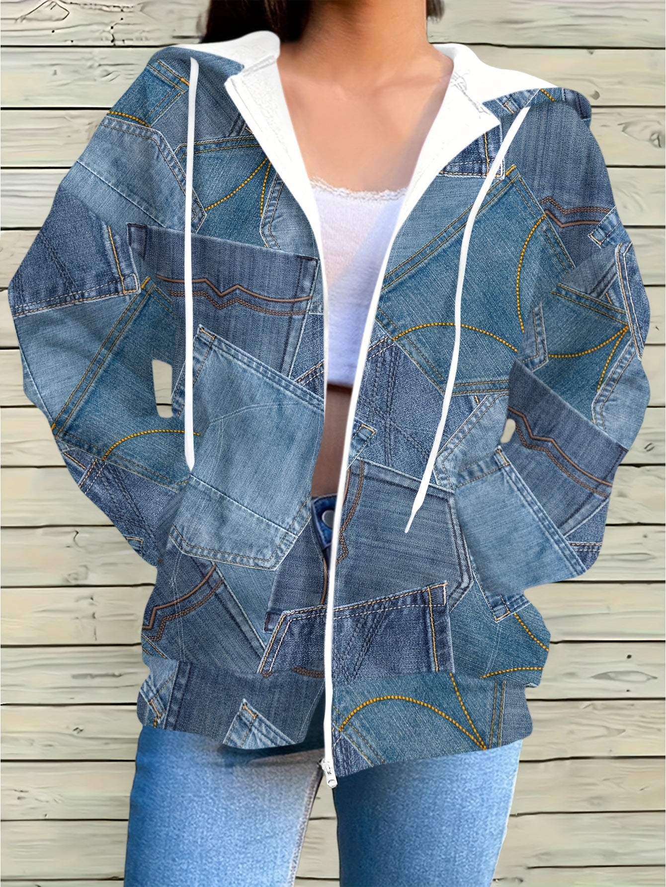 Women's Casual Zip-Up Sweatshirt - Imitation Denim-Style Hoodie