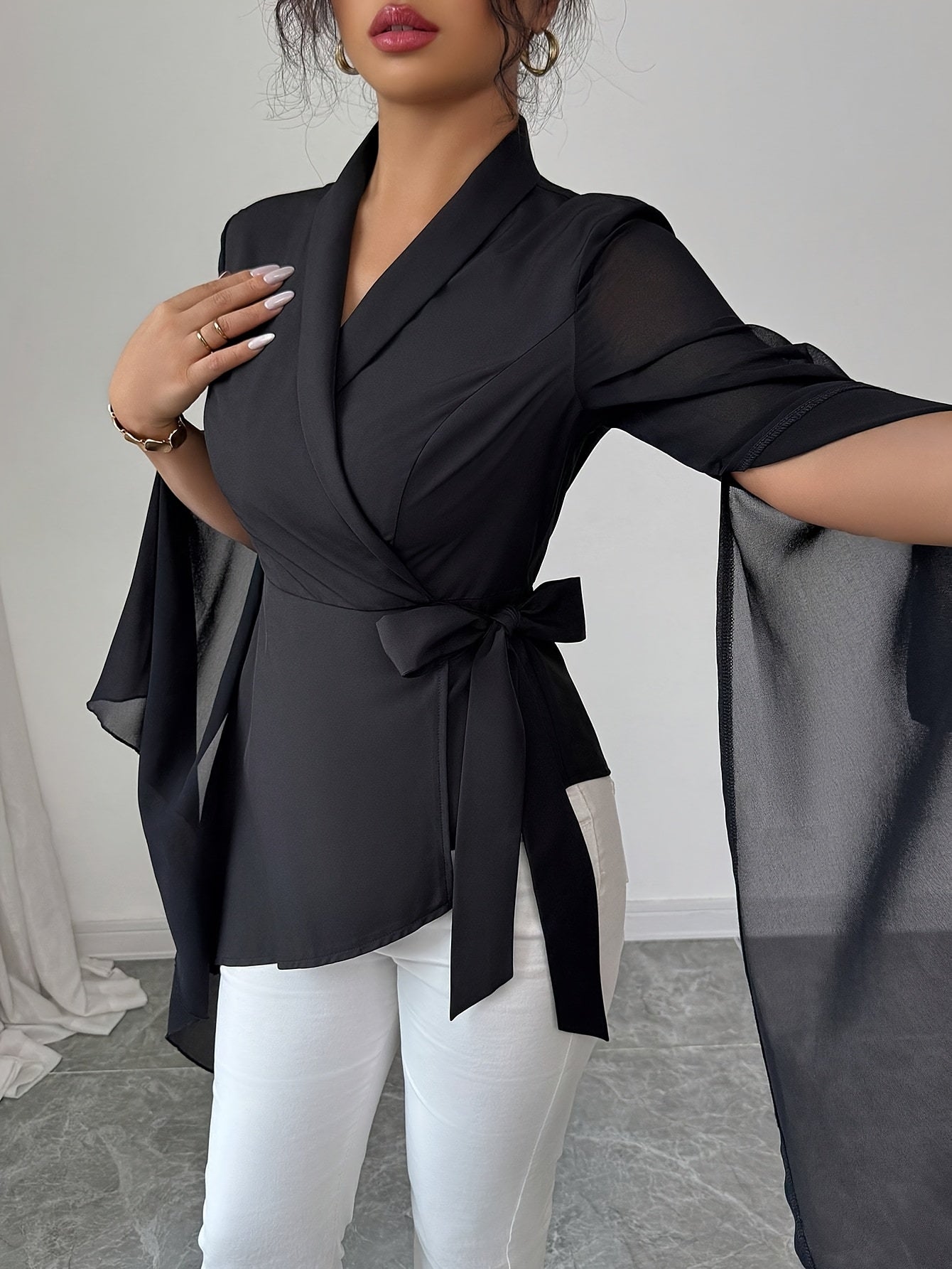 Introducing the Elegant Asymmetrical Sleeve Blouse for Women, a stunning piece designed for the Spring and Fall seasons. Made from a high-quality 95% polyester fabric, this semi-sheer blouse features a unique split sleeve design, adding an element of sophistication to any outfit.
