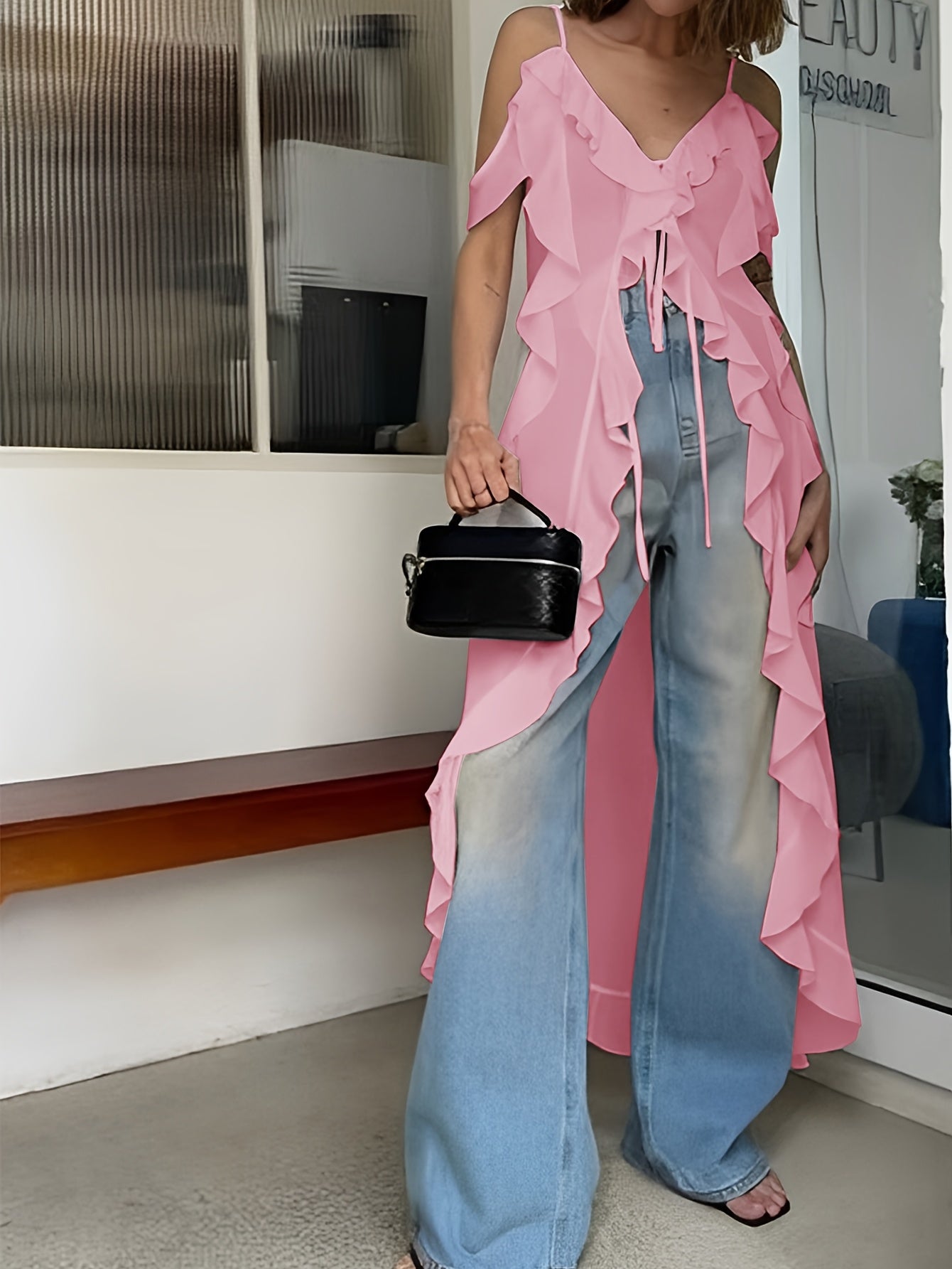 Elevate your poolside appearance with this sexy, semi-sheer cover-up dress that beautifully drapes over your swimsuit. With its playful ruffles and chic design, this dress isn’t just a cover-up; it's a statement piece that will turn heads wherever you go. Whether lounging by the beach or strolling along the boardwalk, this cover-up keeps you stylish and comfortable. Don't miss out on the must-have addition to your summer wardrobe!