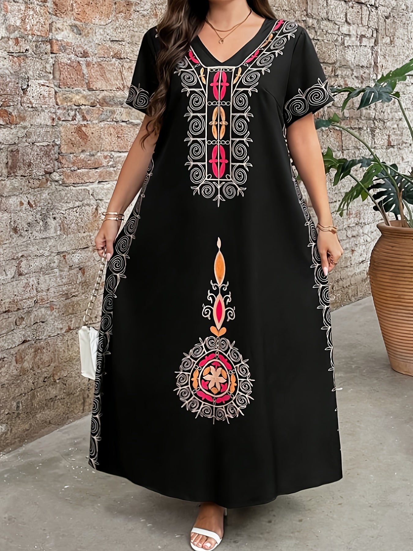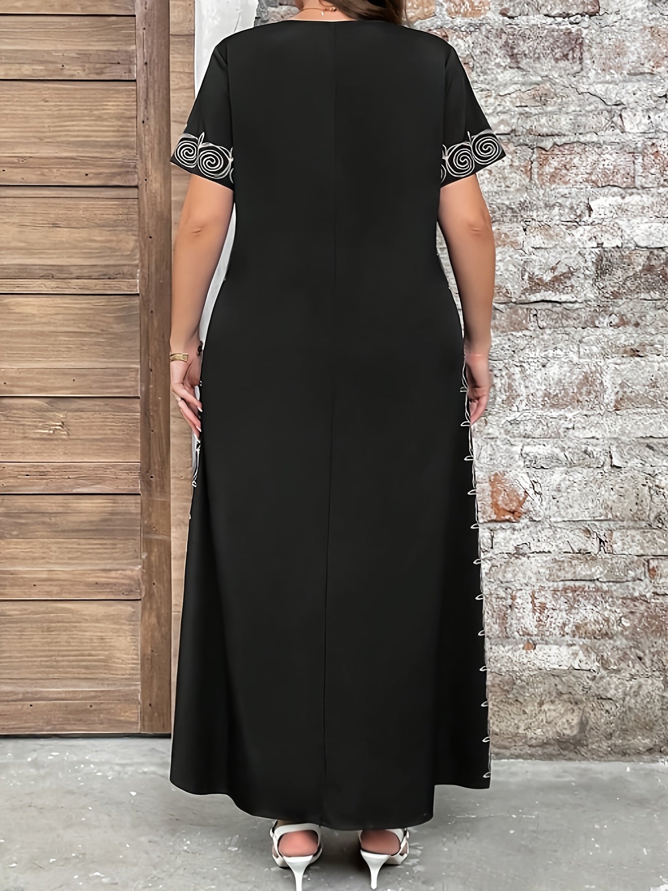 Women's Elegant Black Abaya Dress - Geometric Design & Short Sleeve