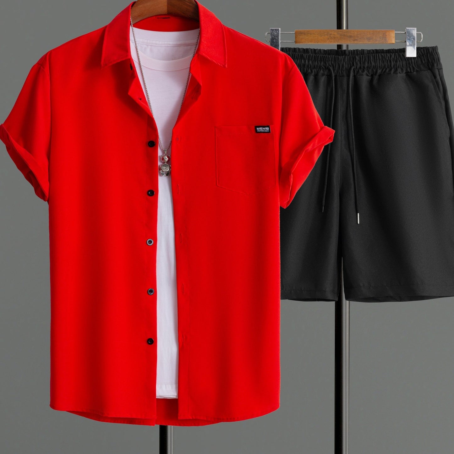 Men's Casual Boho Outfit - Solid Red & Black, Short Sleeve Top