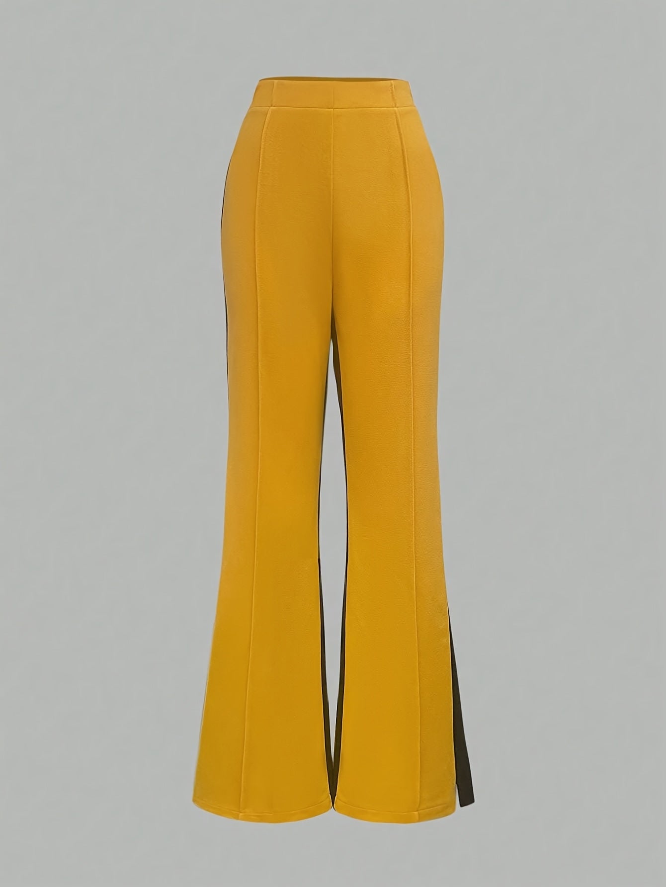 Elevate your wardrobe with our Women's High-Waist Stretchy Yellow Wide Leg Pants, designed for elegance and comfort. Featuring a striking black zipper detail and contrast stitching, these pants are perfect for the daily commute while maintaining a stylish appearance.