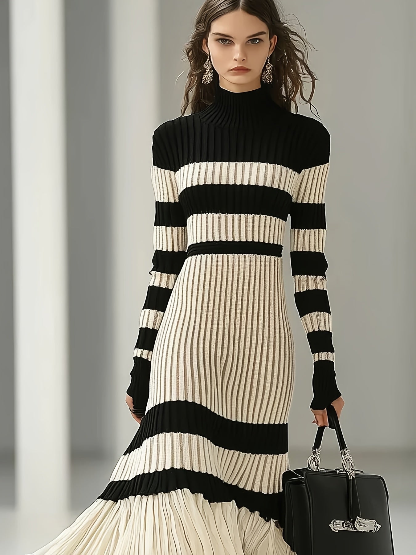 Step into sophistication with the French Elegant Women's High Neck Striped Dress, featuring a striking black and white color-block design. This slim fit, flared hem, knee-length dress is perfect for casual to formal occasions, offering both style and comfort.