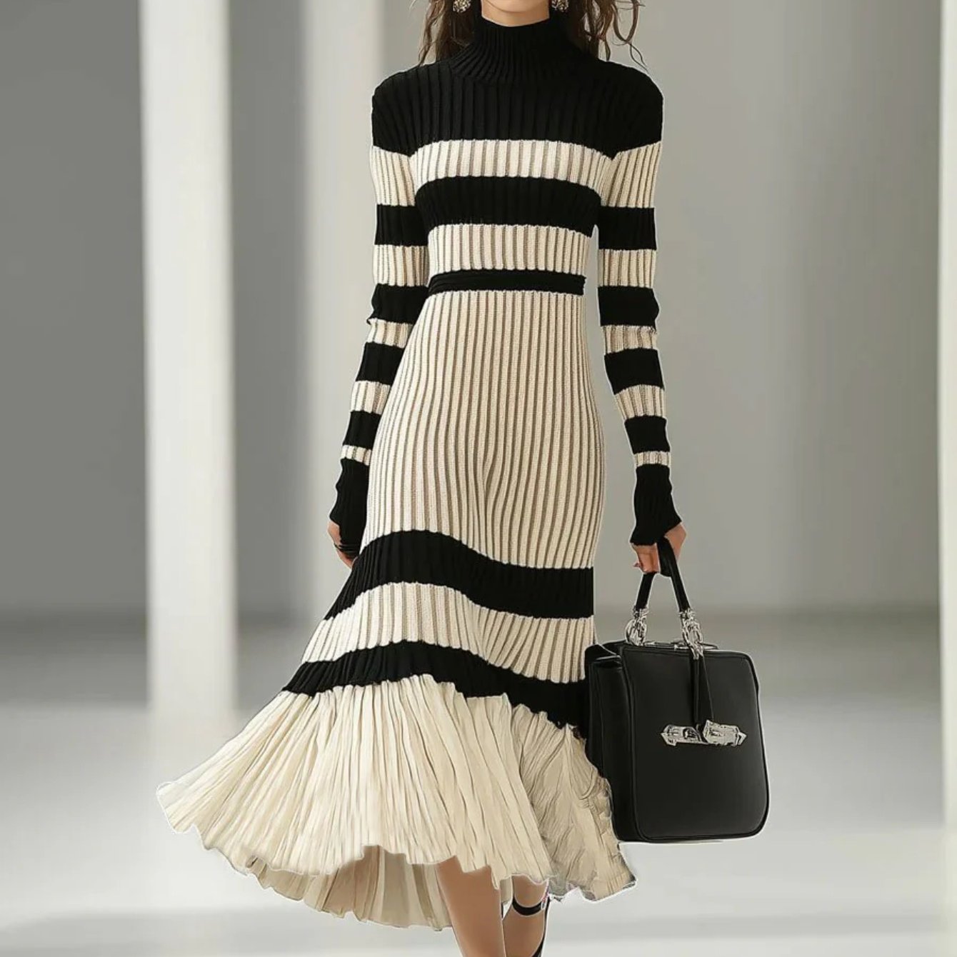 Elegant High Neck Striped Dress - Black & White Slim Fit Style