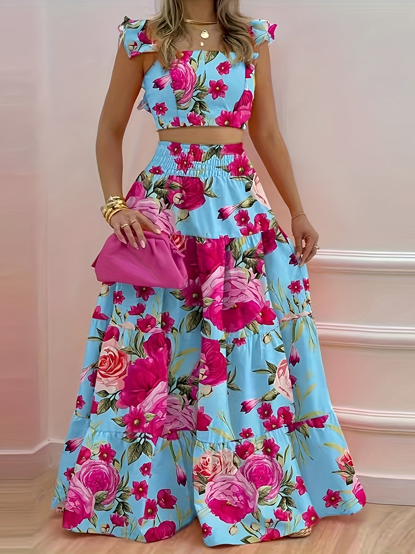 Romantic Blue Floral Two-Piece Set - Ruffle Sleeve Top & Skirt