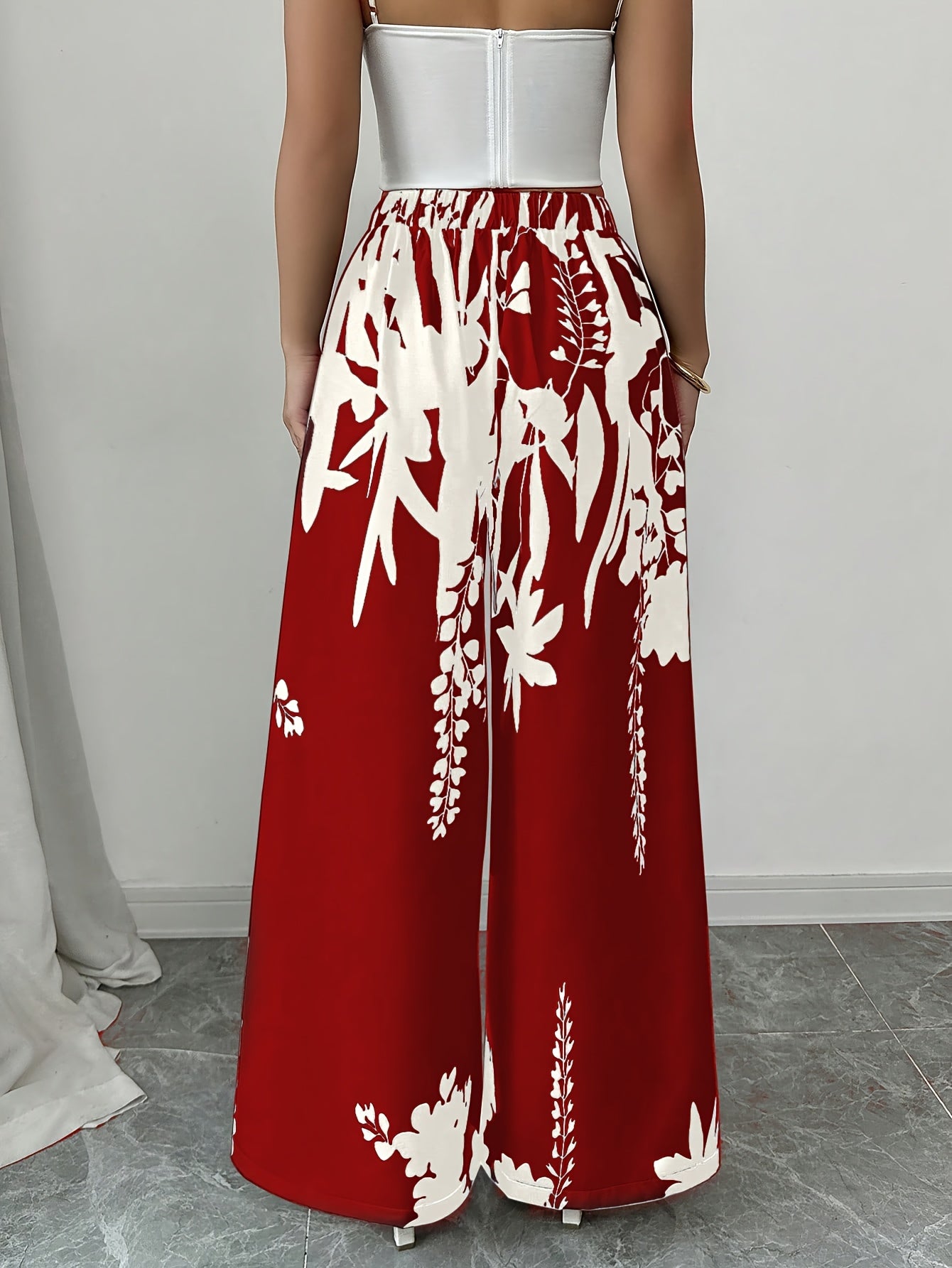 Introducing our Women's Elegant Floral Print Wide-Leg Pants, designed for the modern woman seeking comfort and style. Crafted from lightweight 100% polyester, these pants feature a vibrant red background with a stunning white floral design, making them perfect for any spring, summer, or fall occasion.