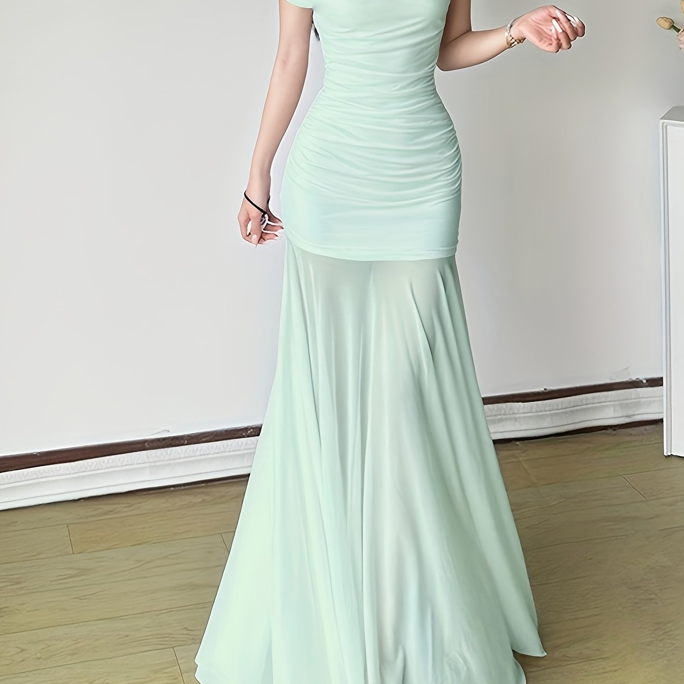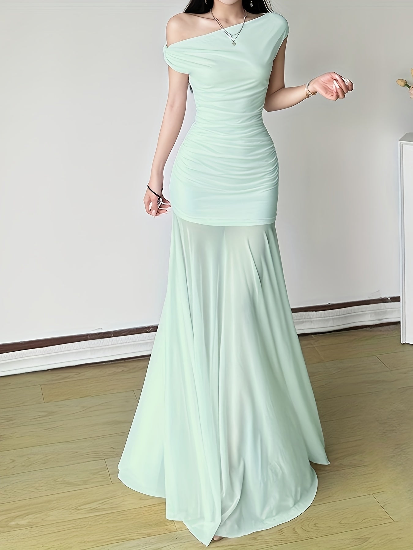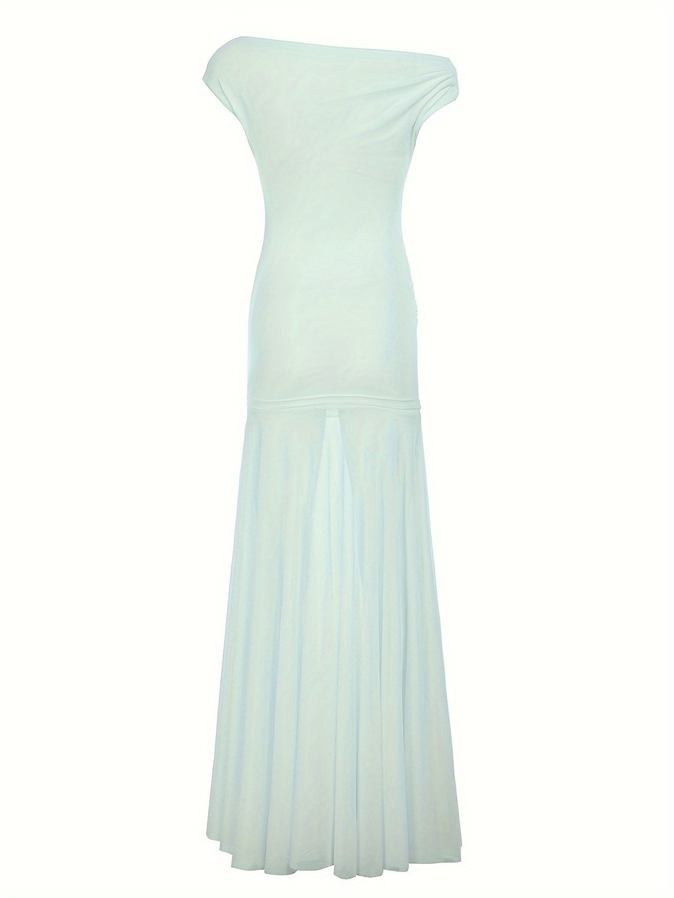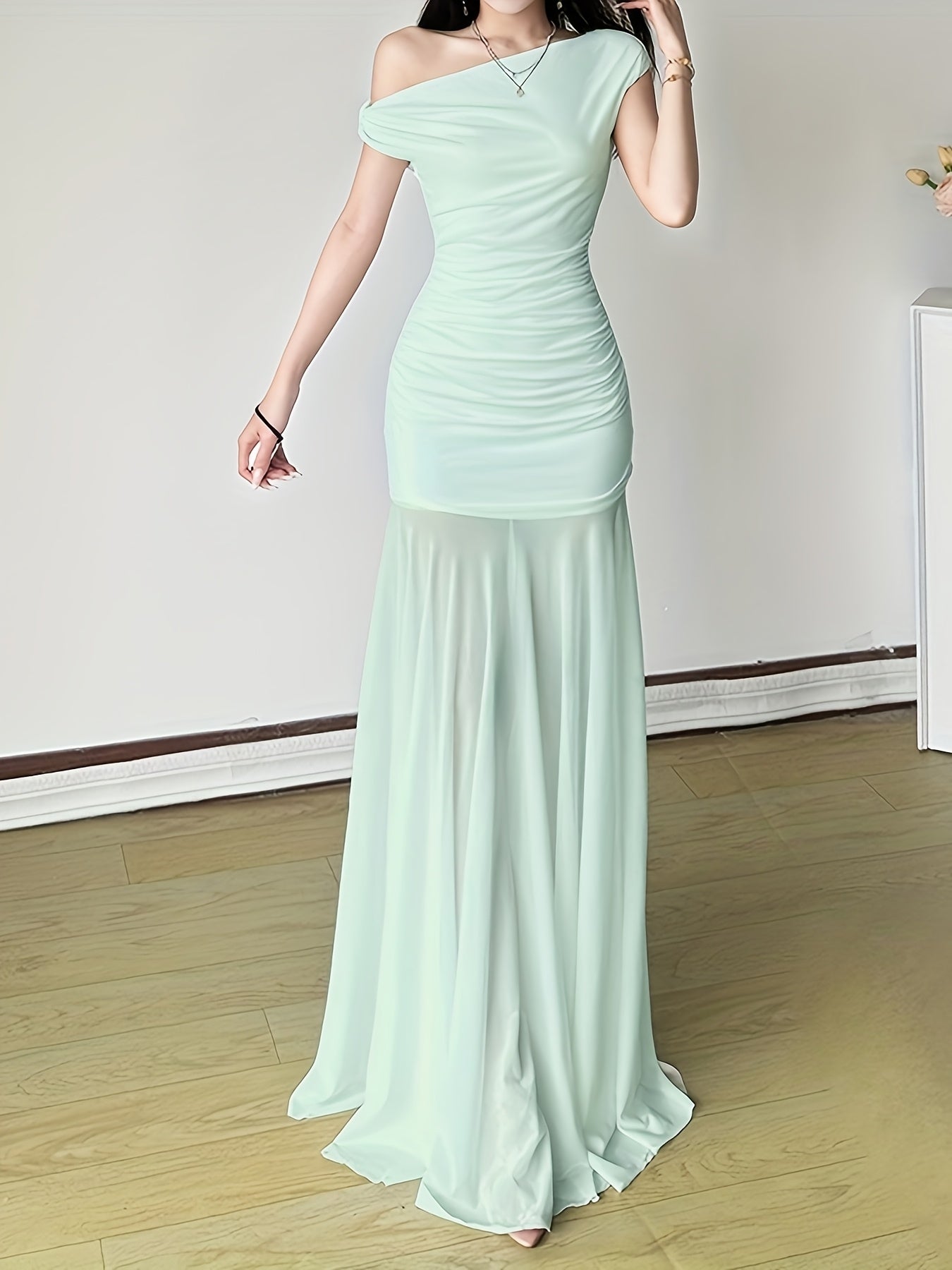 Introducing the Elegant Off-Shoulder Asymmetrical Mesh Panel Dress in Light Mint Green, a stunning bodycon fit that accentuates every curve. This flowing design is perfect for spring and summer events, adding a touch of sophistication to your formal evening wear wardrobe.