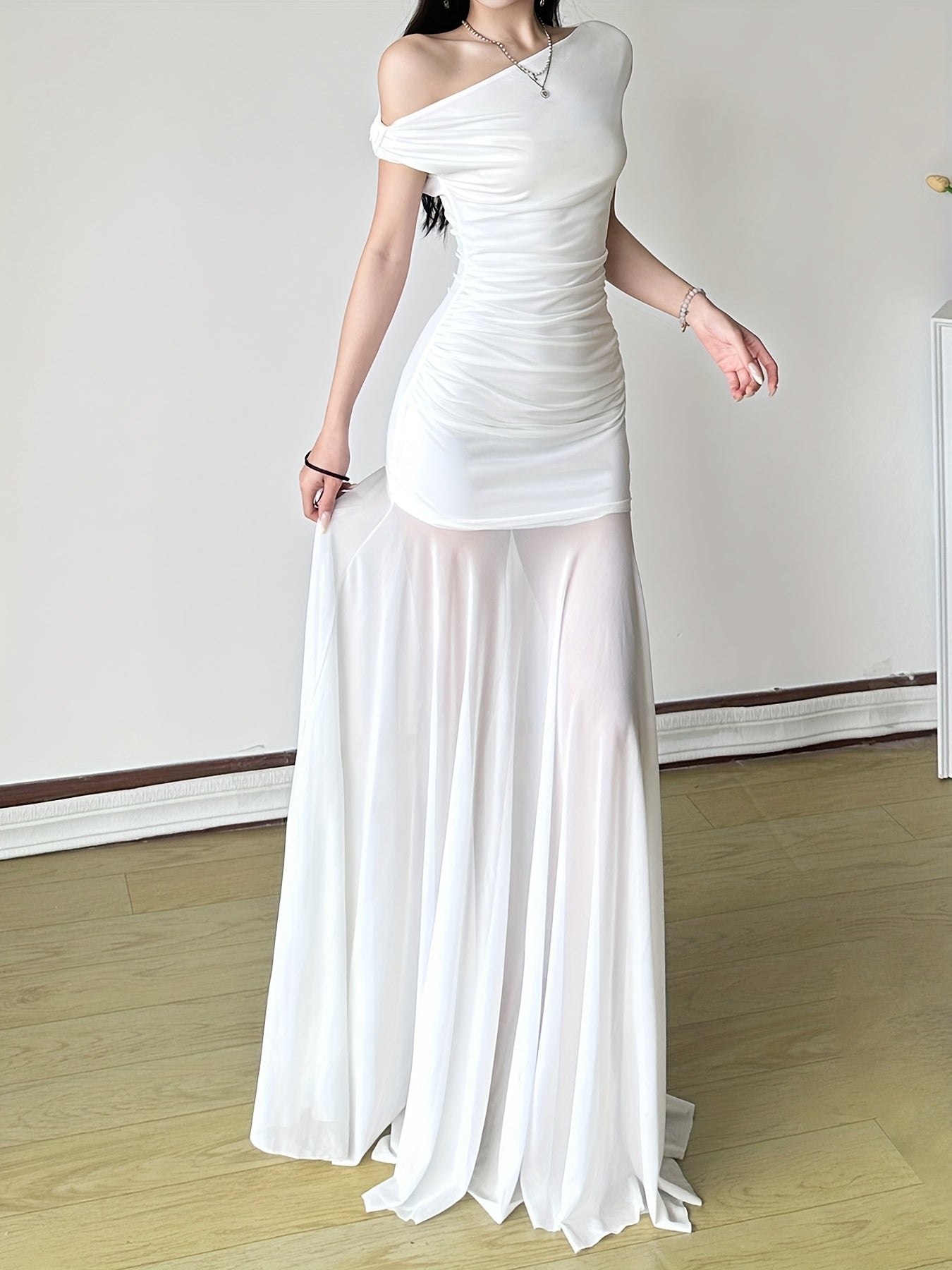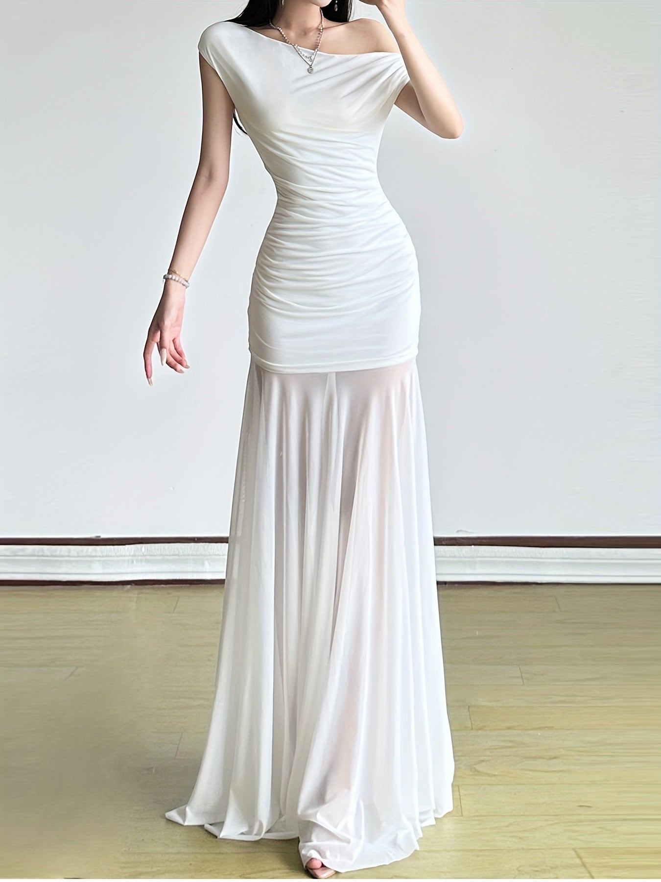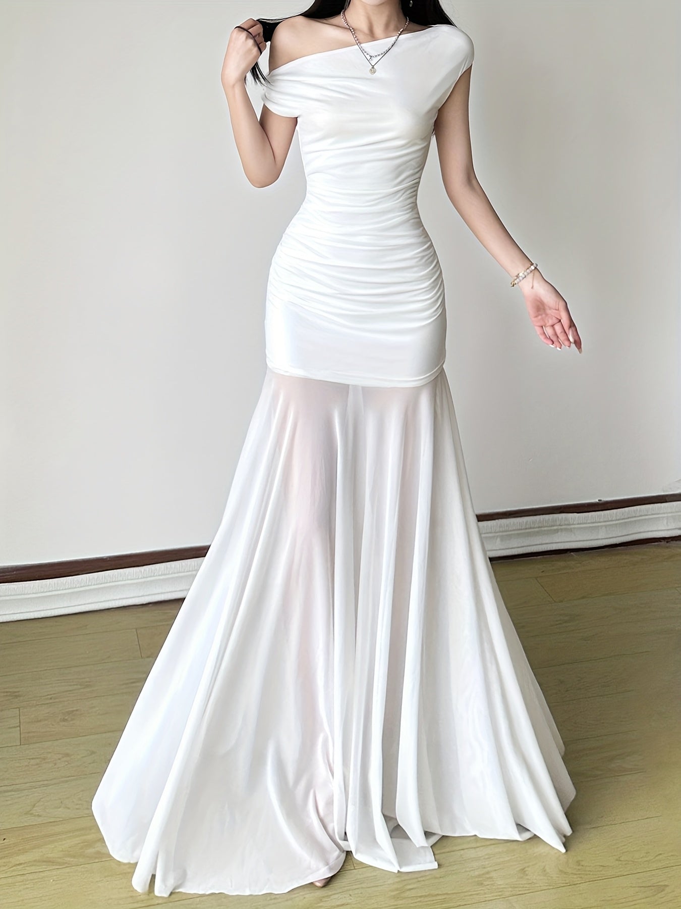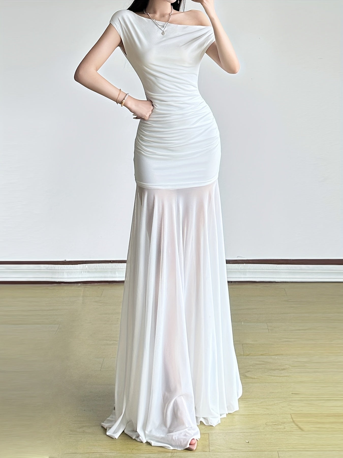 Introducing the Elegant Off-Shoulder Asymmetrical Mesh Panel Dress in Light Mint Green, a stunning bodycon fit that accentuates every curve. This flowing design is perfect for spring and summer events, adding a touch of sophistication to your formal evening wear wardrobe.