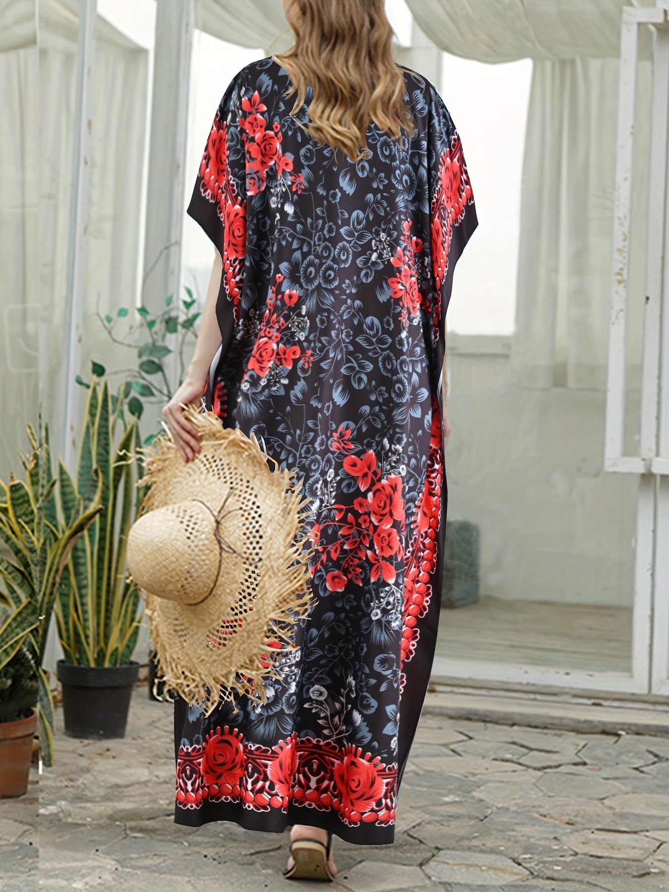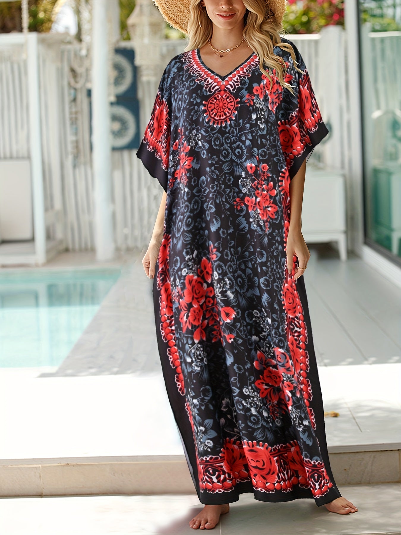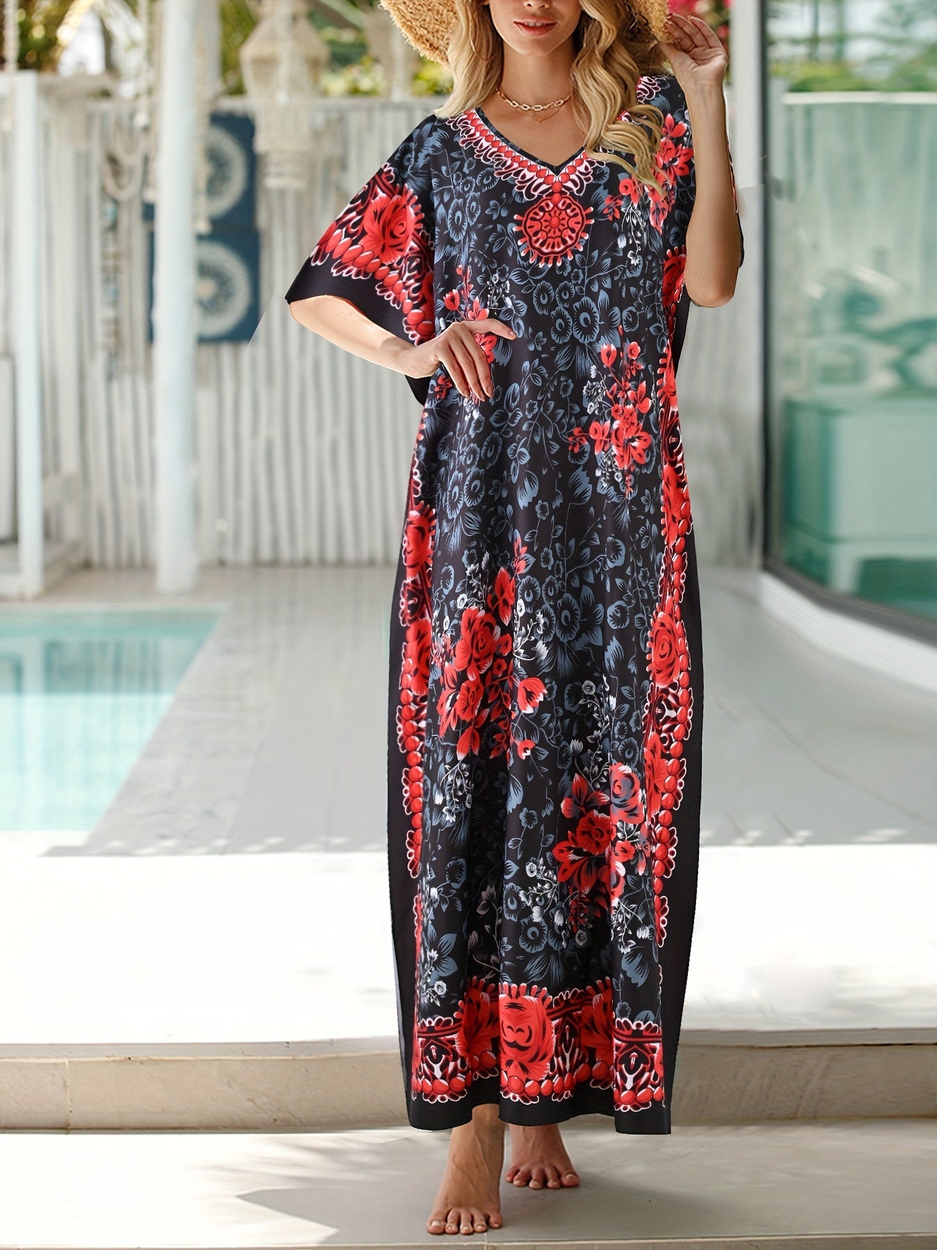 Women’s Floral Print V Neck Kaftan - Casual Maxi Dress for Spring