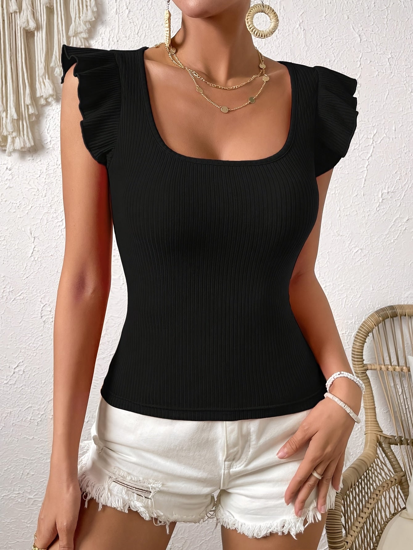 Elegant Ruffle Square Neck T-Shirt - Solid Color, Skinny Fit Top
