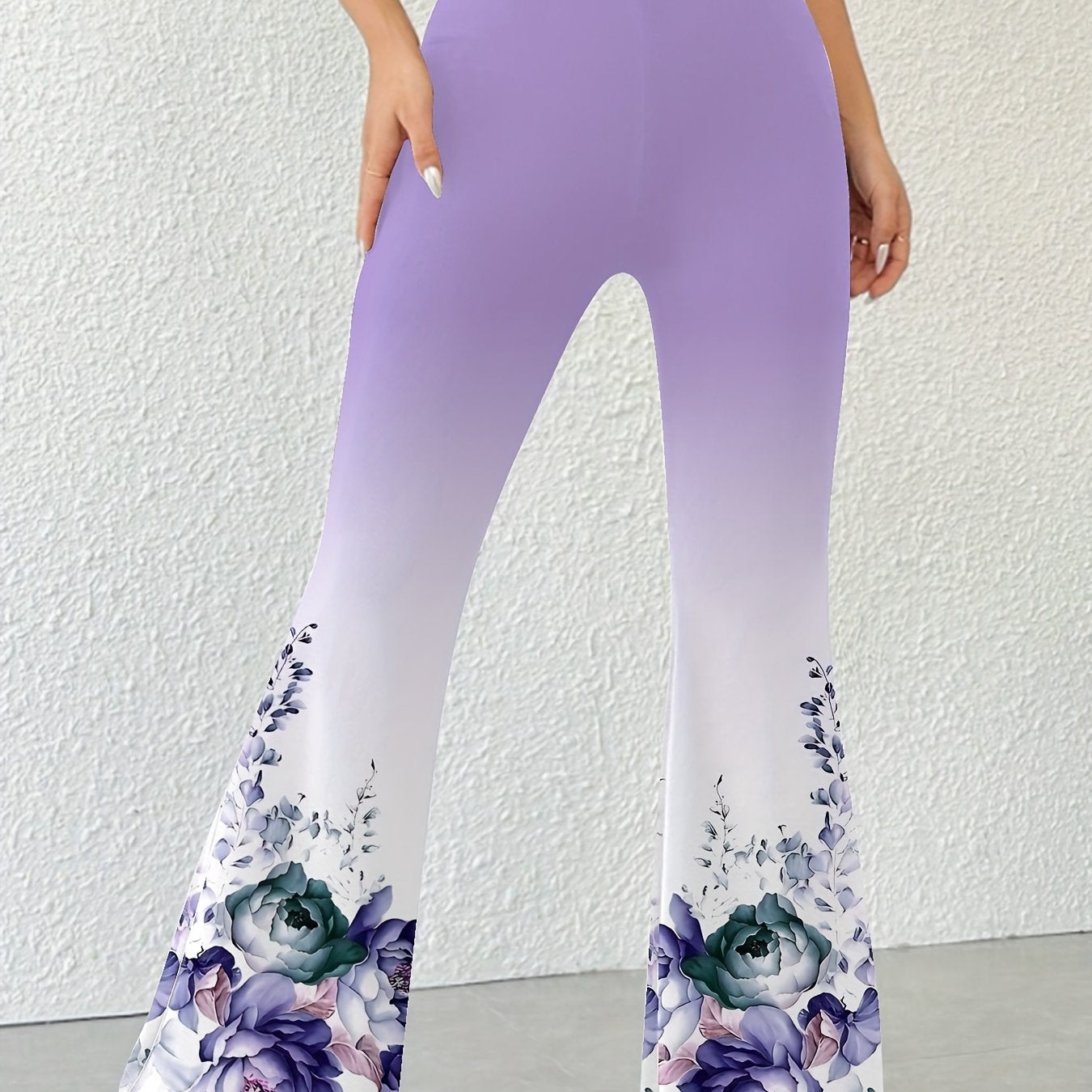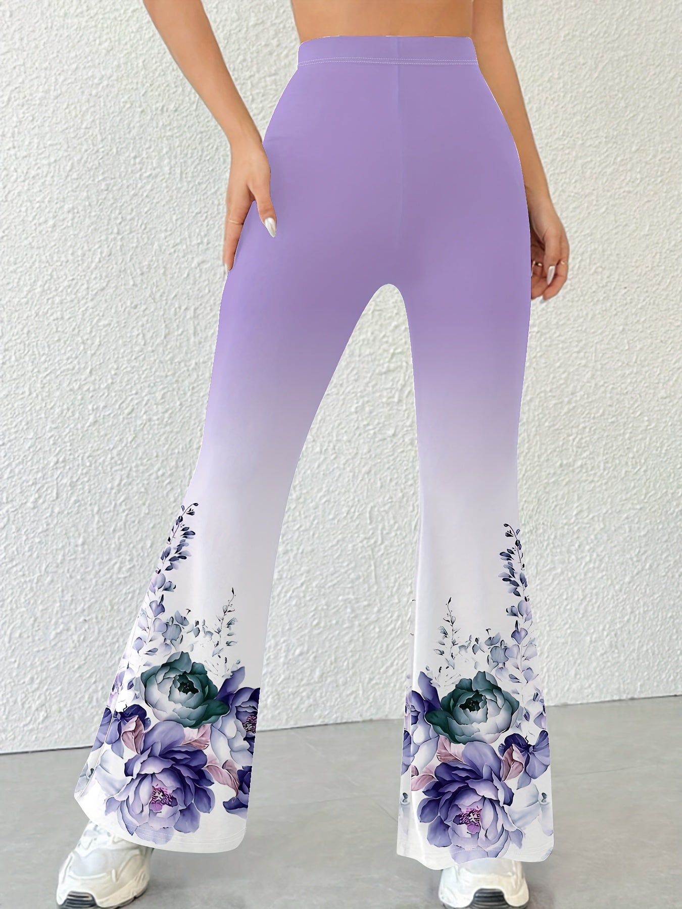 Elevate your wardrobe with our Women's High-Waisted Flared Pants, featuring a stunning lavender-purple floral gradient design. Made from quality polyester, these non-transparent, stretchy trousers are perfect for all-season wear, blending elegance with comfort. Ideal for both formal and casual occasions, they are a versatile addition to any outfit.