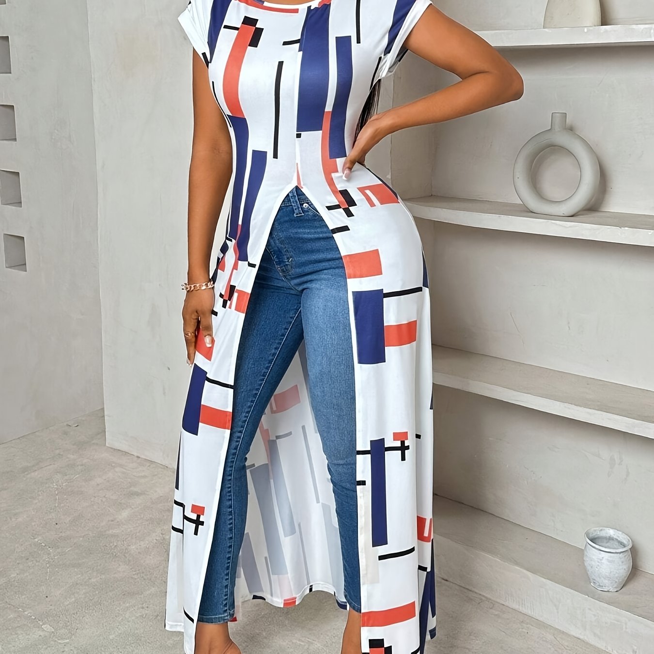 Introducing our Women's Elegant Geometric Print Long-Sleeve T-Shirt, a perfect blend of style and comfort for your summer wardrobe. Made from 100% polyester, this long-length shirt features a stunning geometric pattern that adds a touch of sophistication to any outfit.