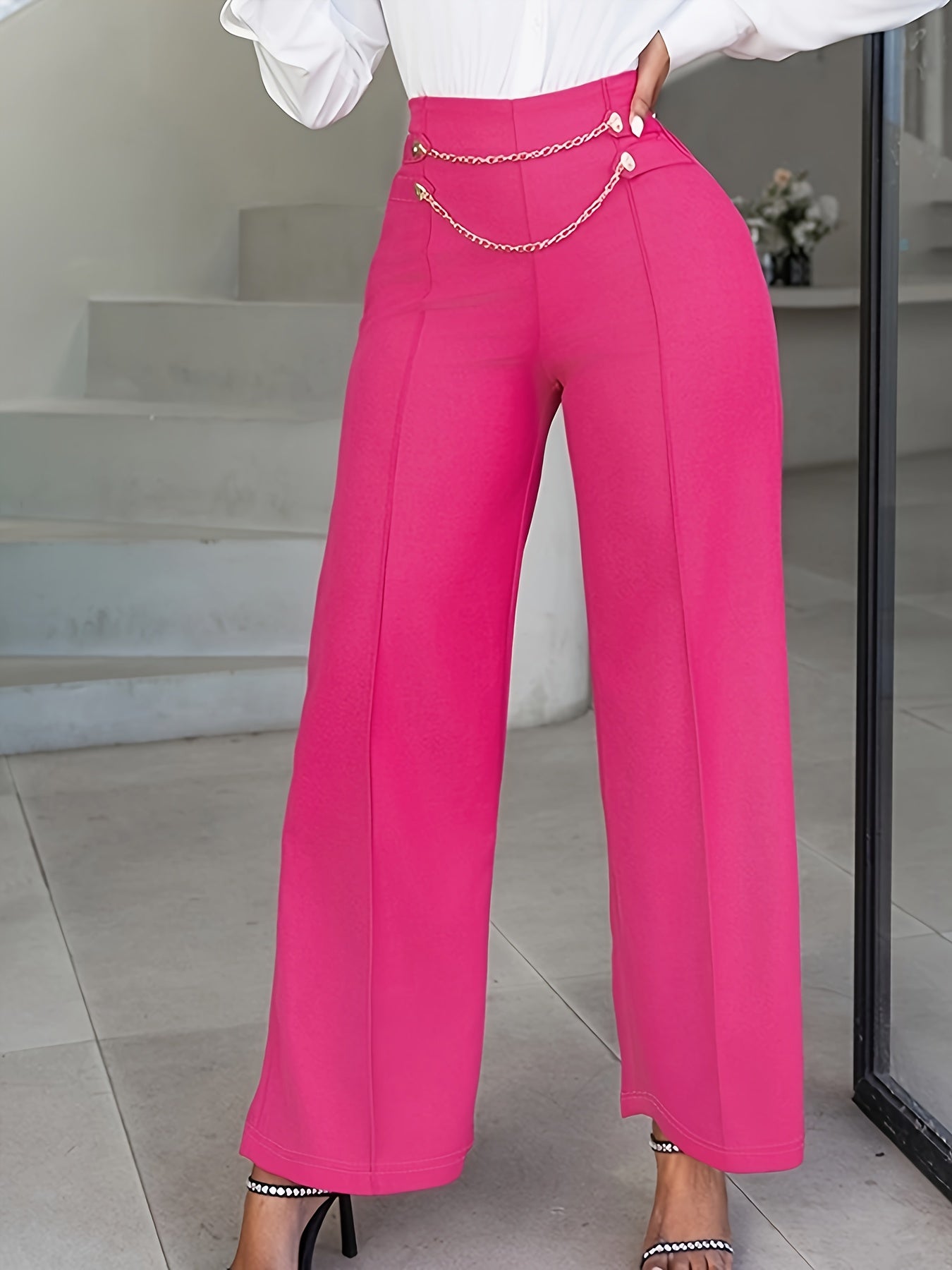 Elegant Wide-Leg Pants - Solid Color with Metal Chain Detail