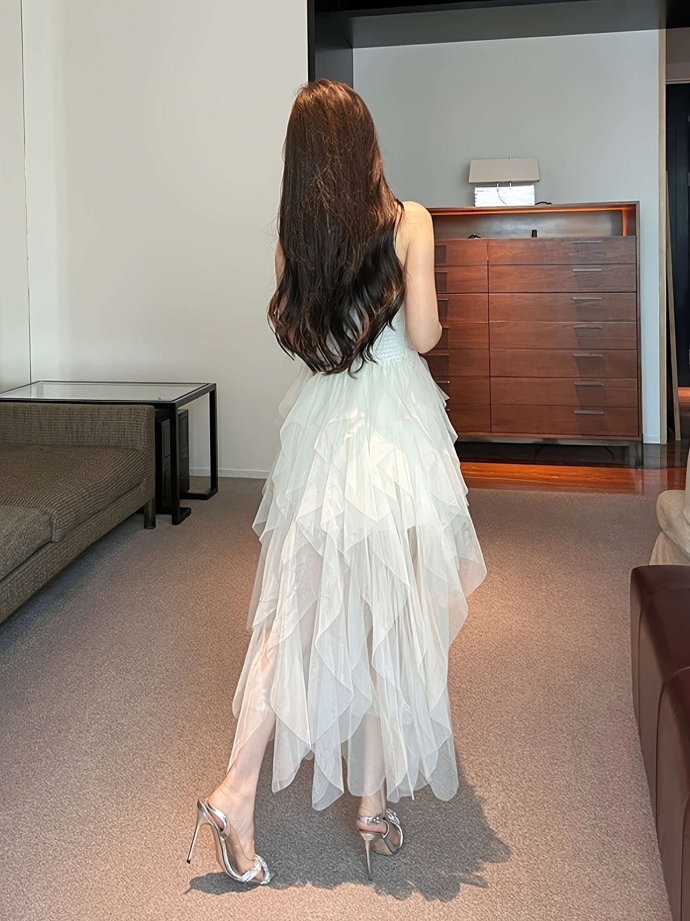 Elegant Asymmetrical Midi Dress - Sleeveless V-Neck Tulle Skirt
