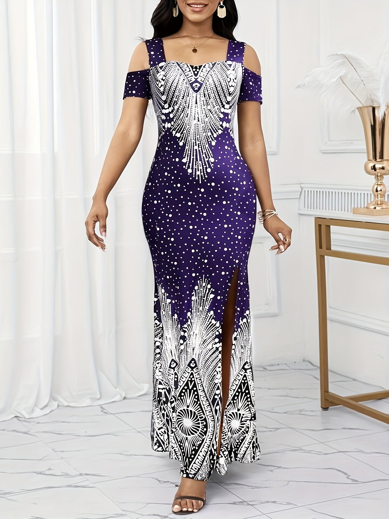 Introducing the Women's Elegant Paisley Print Square Neck Off-Shoulder Evening Dress, a stunning blend of sophistication and comfort. This bodycon mermaid gown features a stylish side slit and waist accent, making it ideal for summer formal parties or evening events. Crafted from stretchy fabric, it promises a comfortable fit while ensuring you look effortlessly chic.