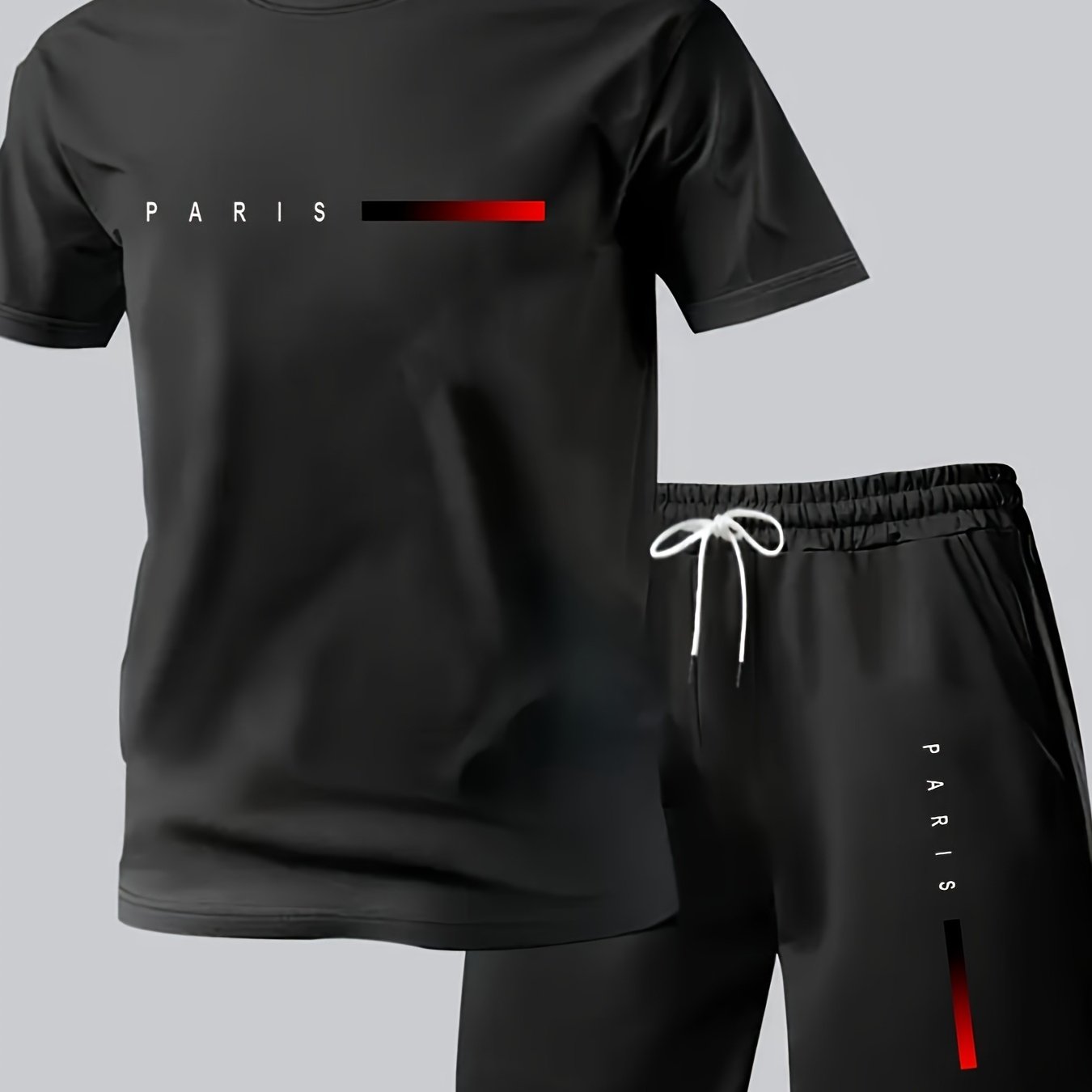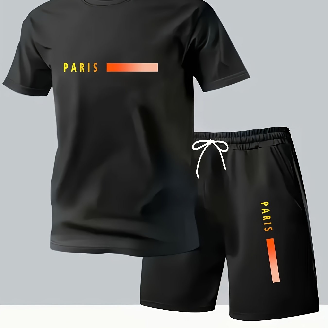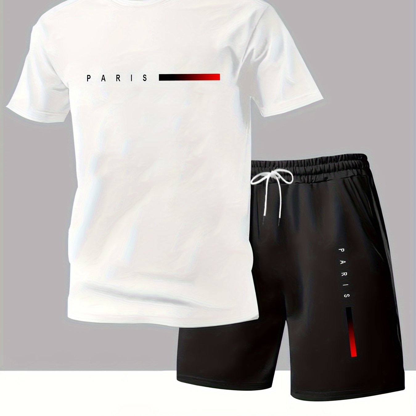 Elevate your summer wardrobe with the Paris Gradient Letter Print Men's Set, which features a casual crew neck T-shirt paired with comfortable shorts. Designed for versatility and comfort, this set is perfect for any casual outing.