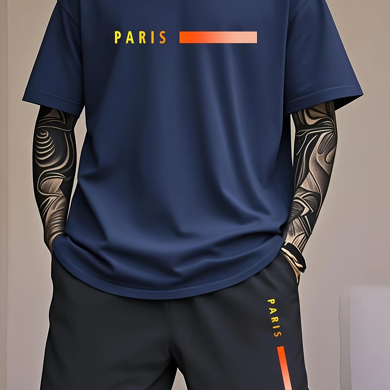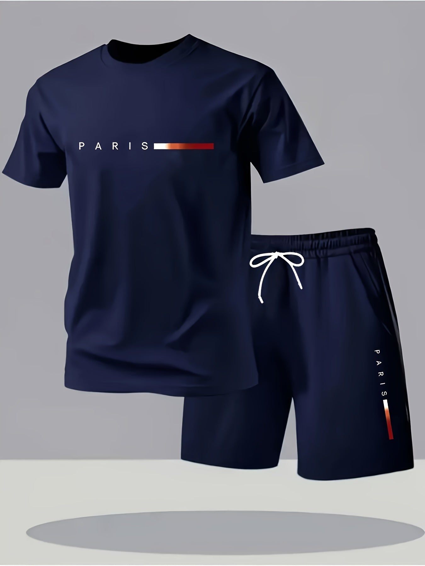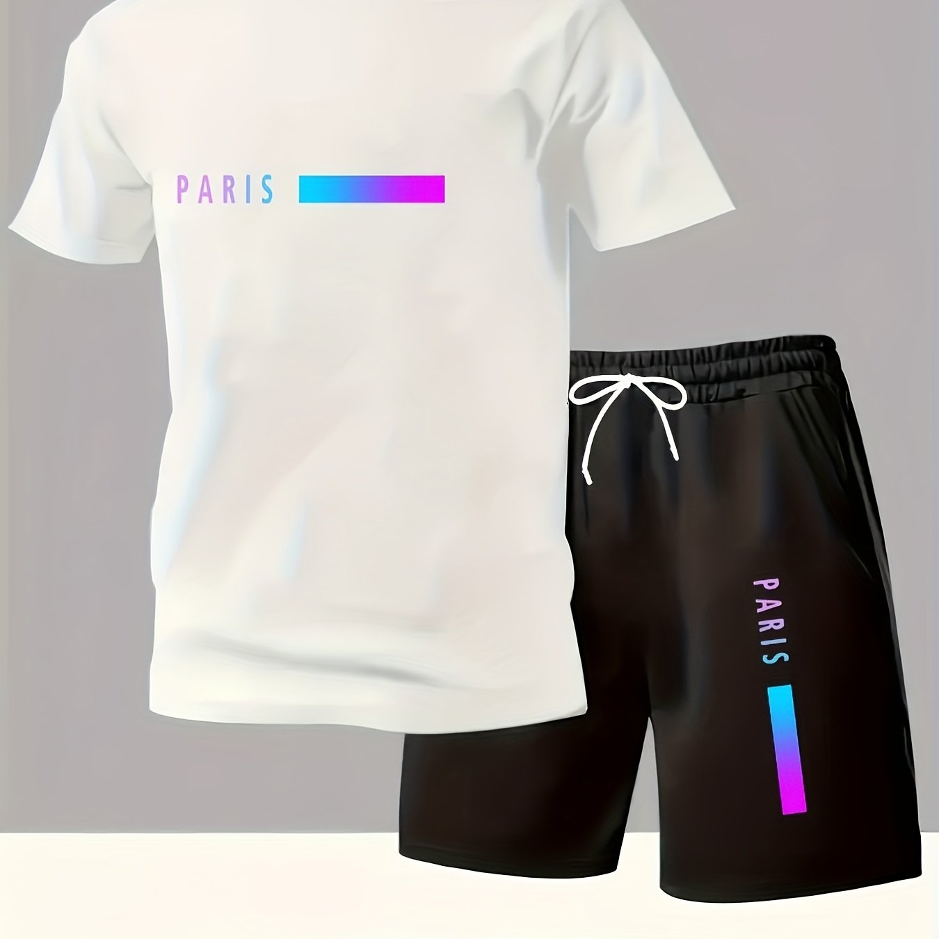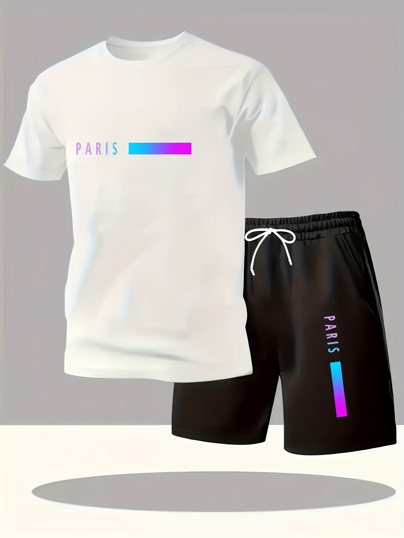 Paris Gradient Letter Print Men's Set - Casual Crew Neck T-Shirt & Shorts
