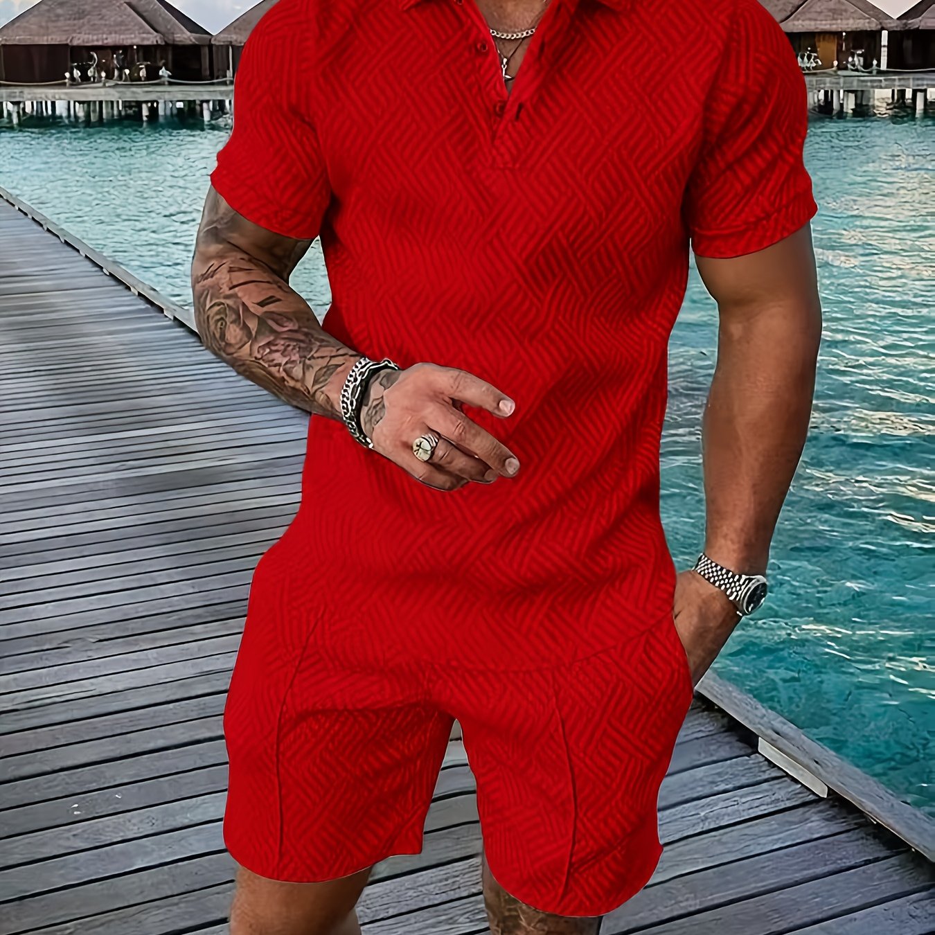Men's Casual Summer Polo Shirt & Shorts Set - Stretch Fabric, Red Color