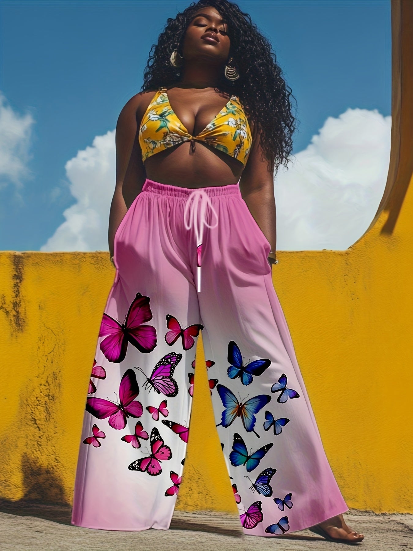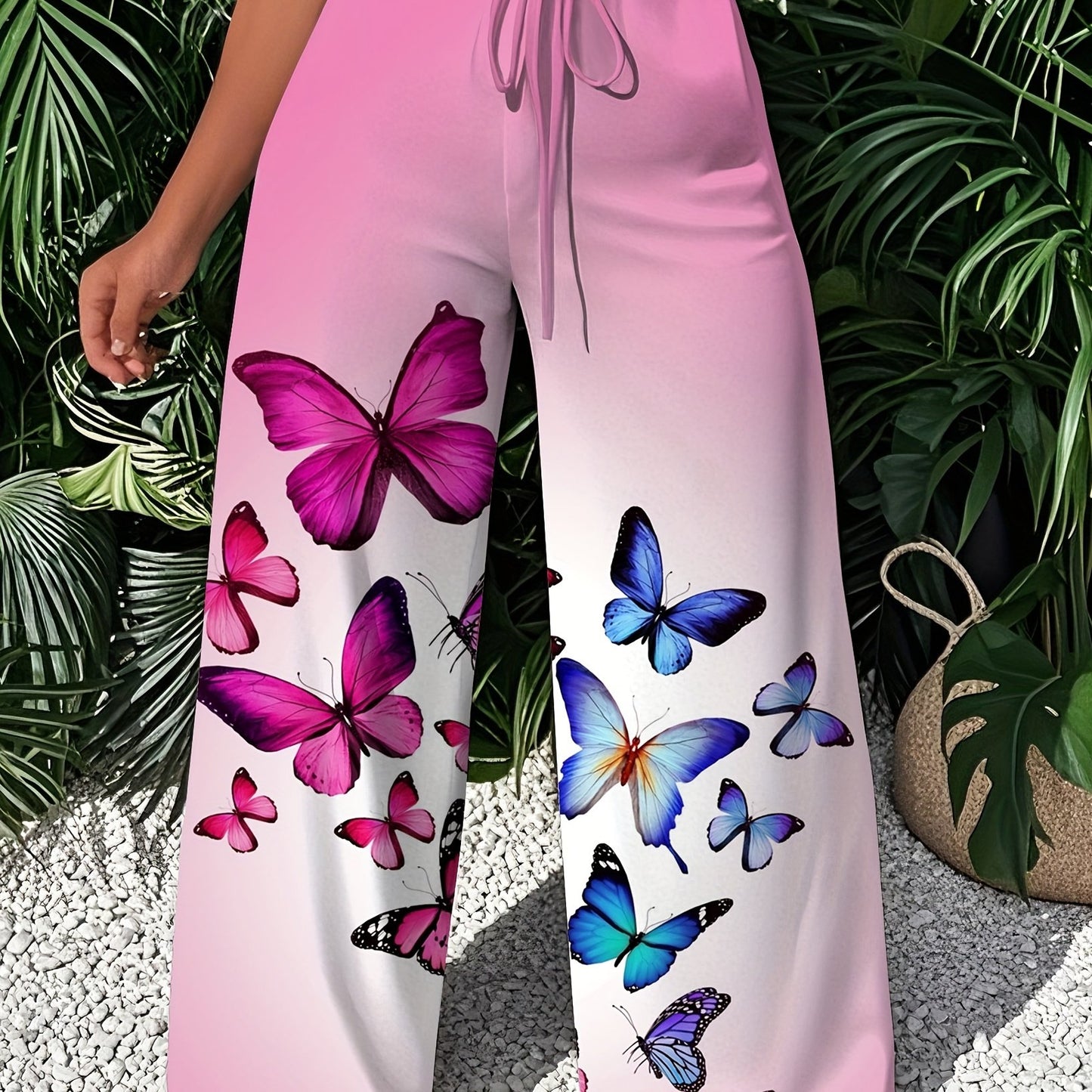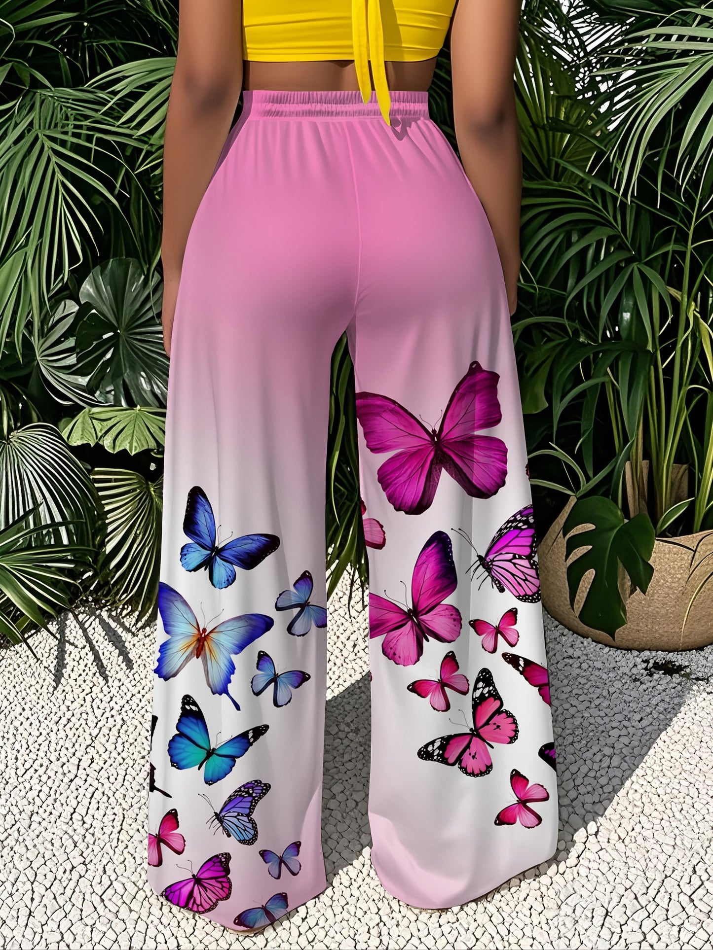 Elevate your summer wardrobe with our Women's Summer Elegant Loose-Fit Wide Leg Pants, designed with a stunning pink gradient butterfly print. Made from 100% lightweight polyester, these pants offer both comfort and style, making them perfect for casual outings.