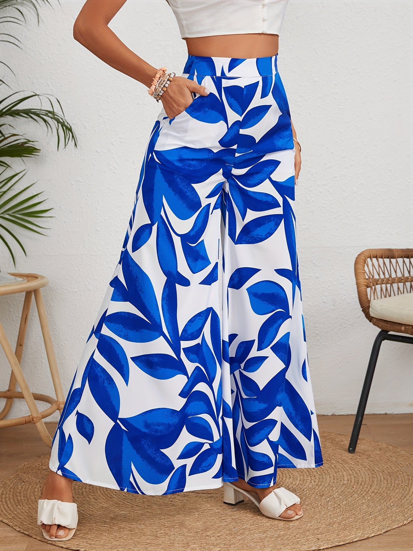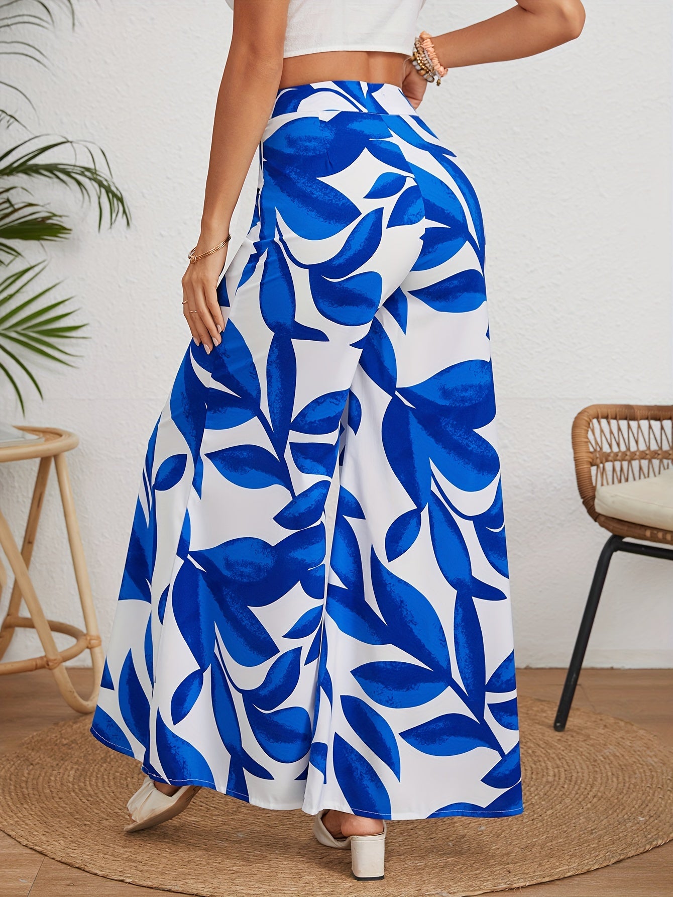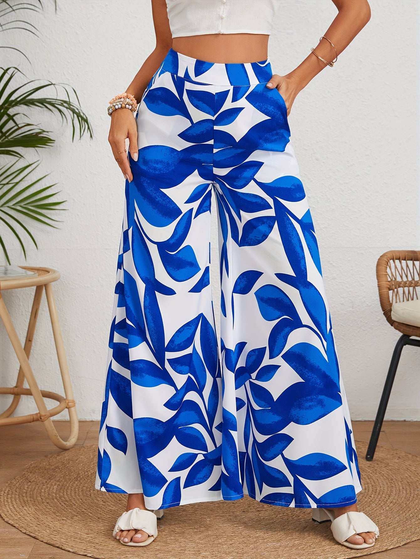 Discover stylish comfort with the Women's High-Waist Tropical Leaf Print Wide Leg Pants, featuring an elegant blue and white floral design perfect for the spring and summer seasons. Made from 100% polyester, these pants offer a loose fit that complements any casual chic outfit.