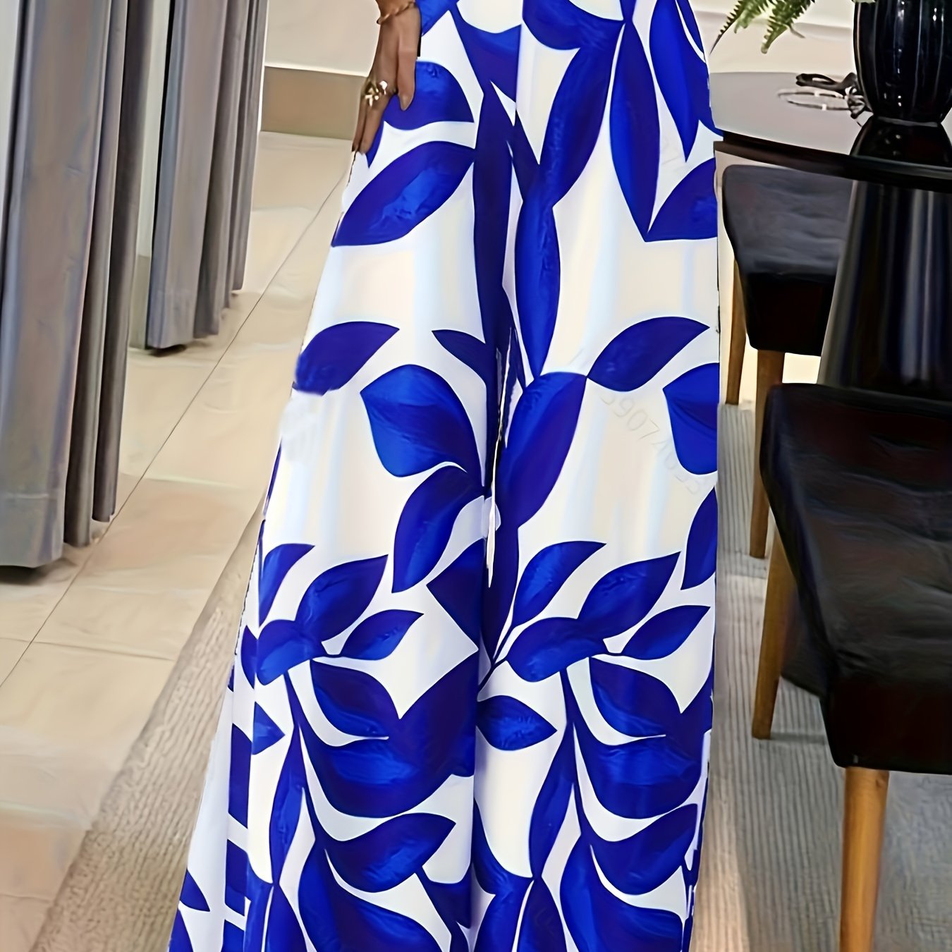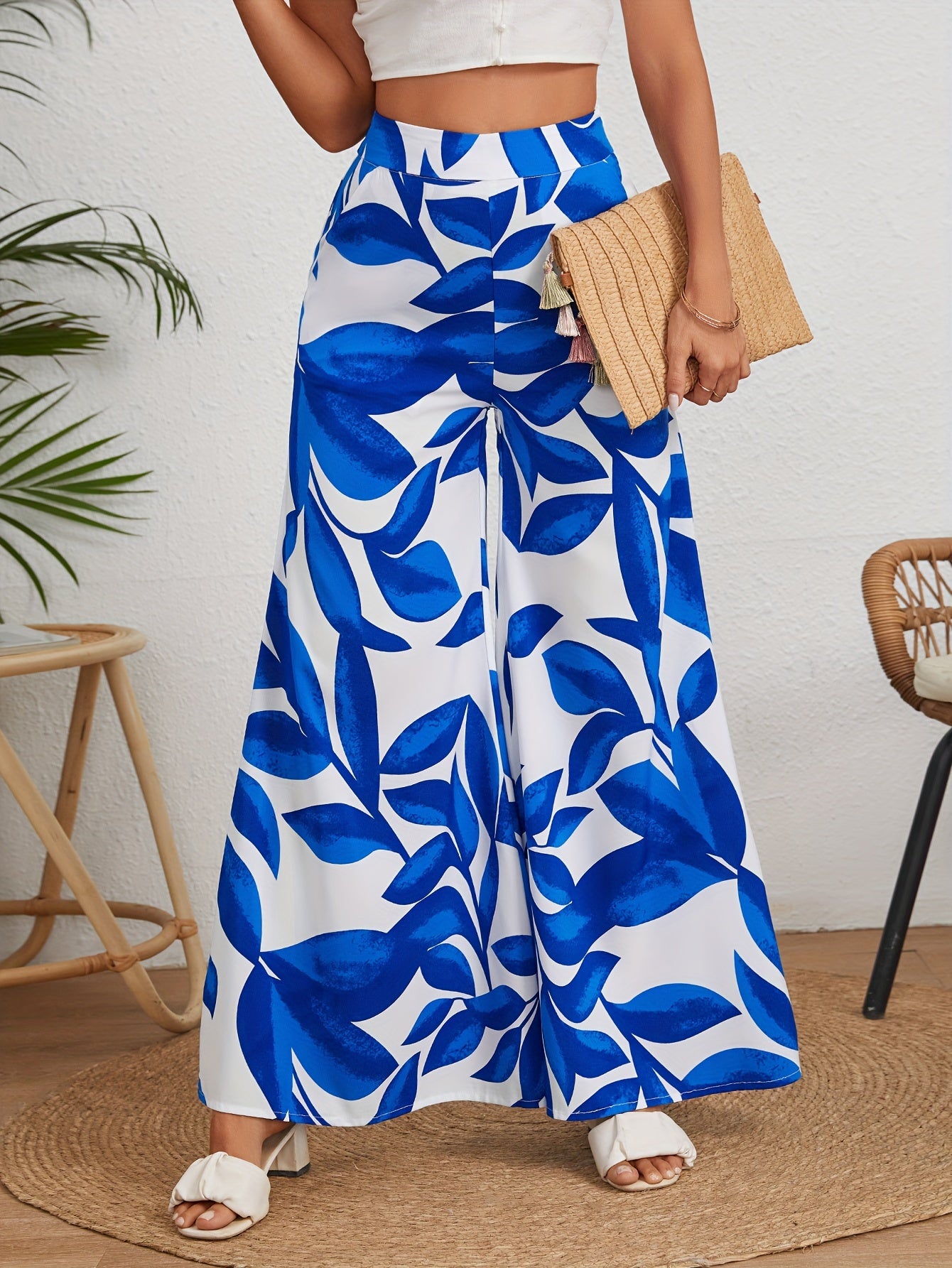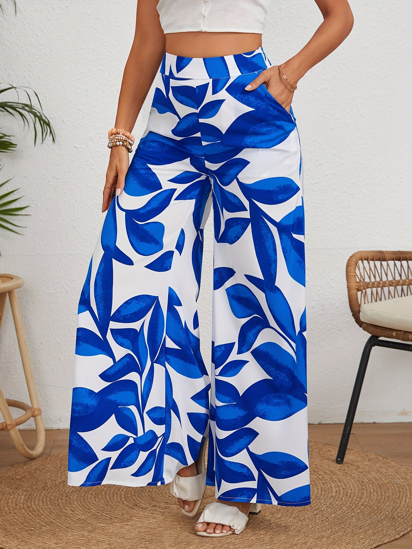 Discover stylish comfort with the Women's High-Waist Tropical Leaf Print Wide Leg Pants, featuring an elegant blue and white floral design perfect for the spring and summer seasons. Made from 100% polyester, these pants offer a loose fit that complements any casual chic outfit.