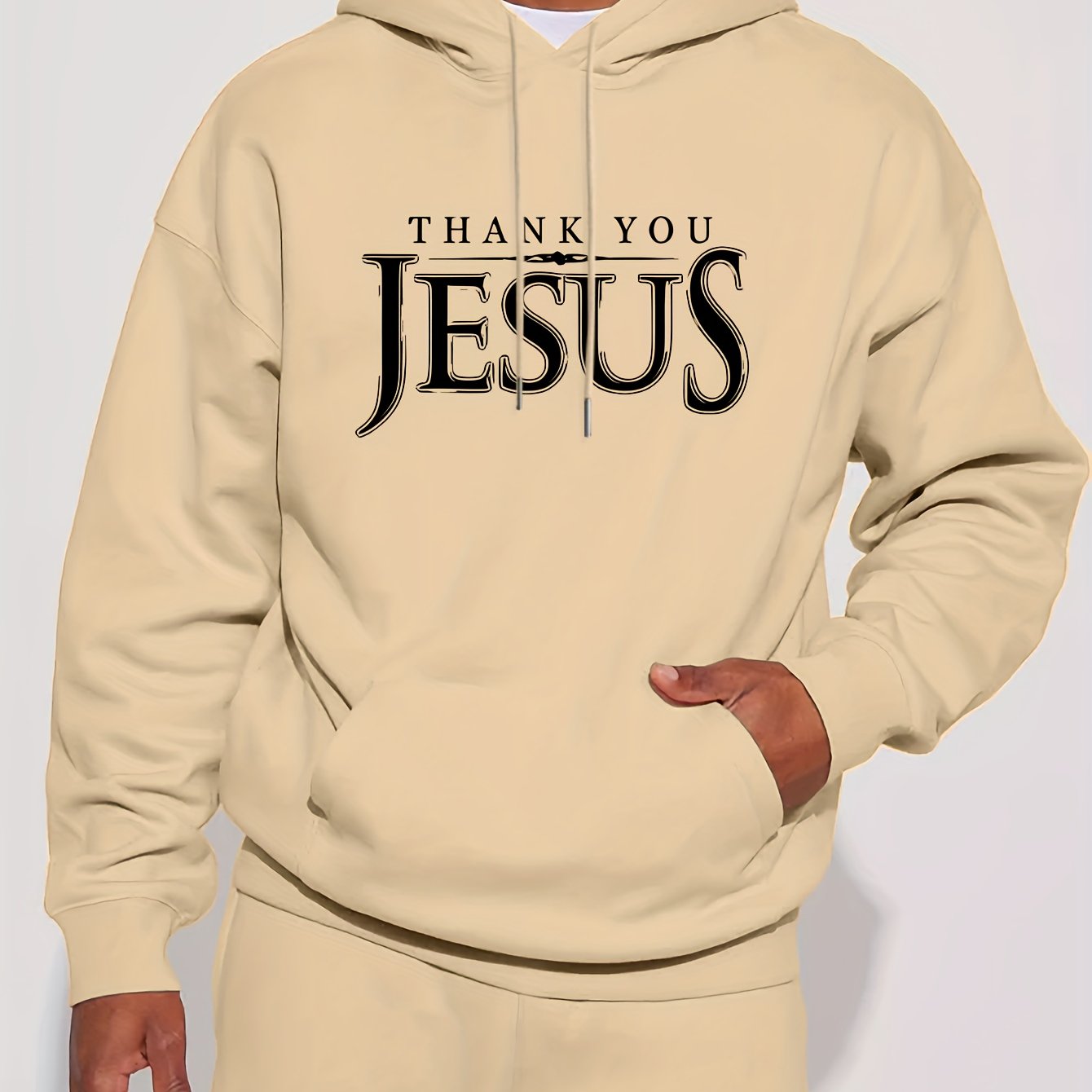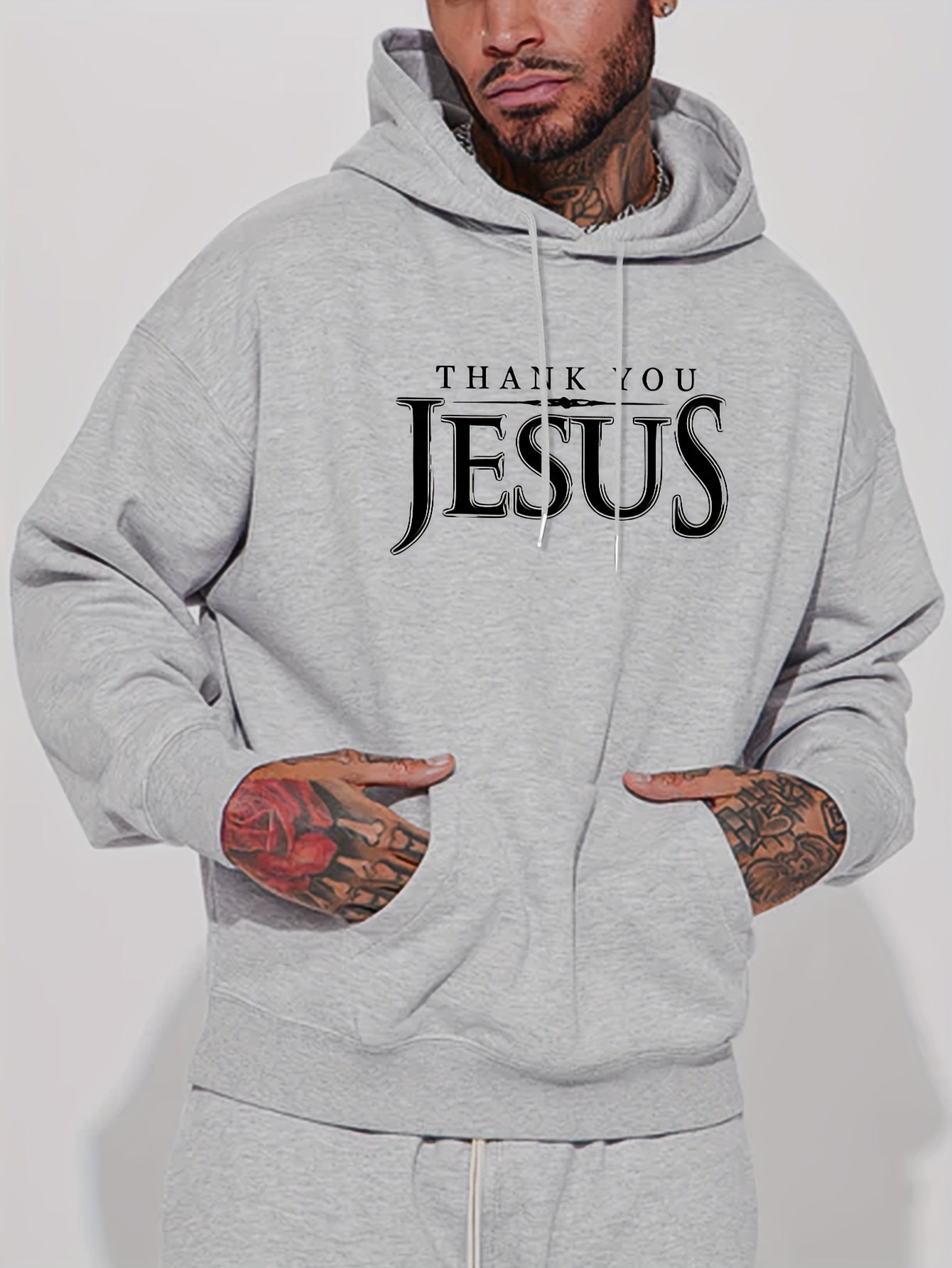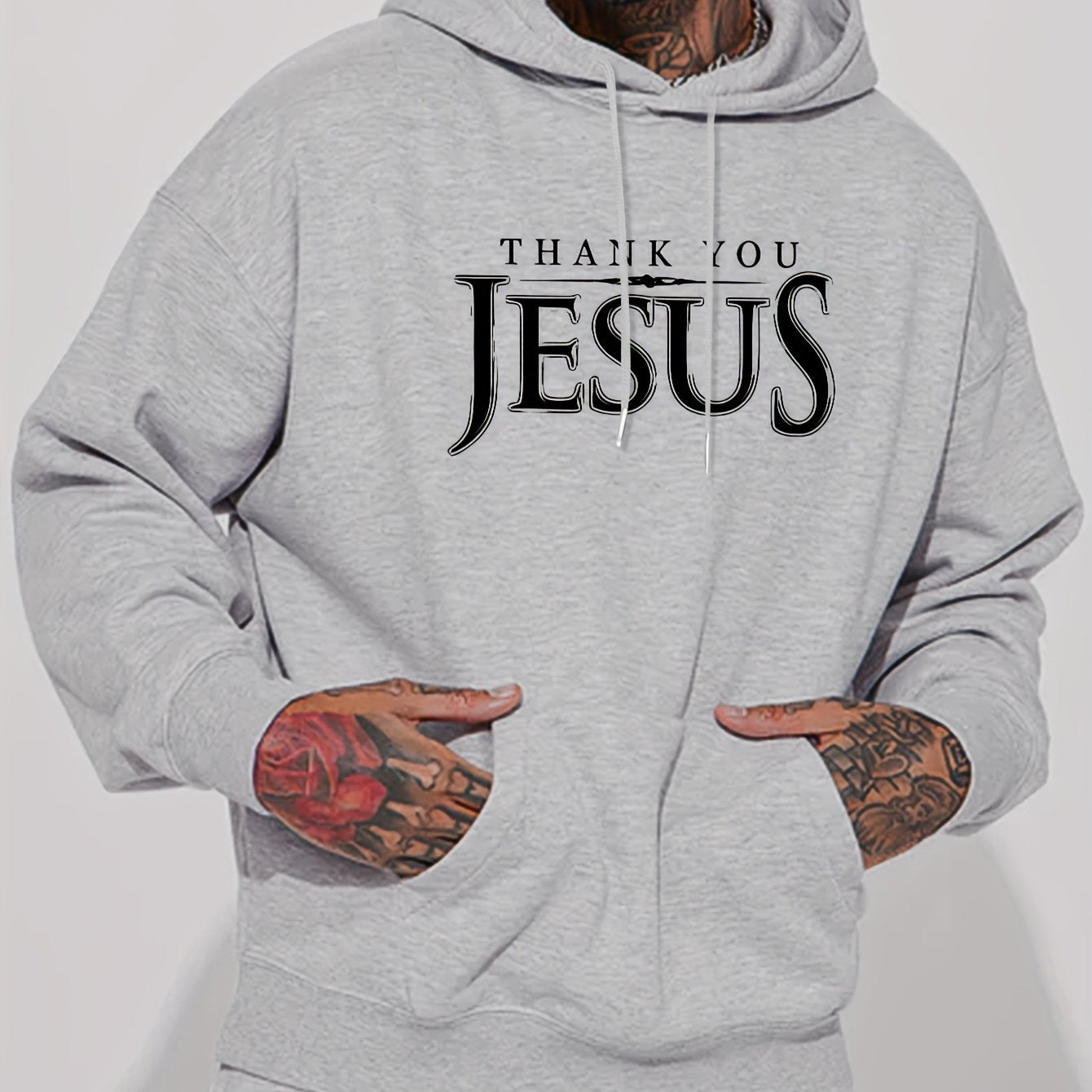 "THANK YOU JESUS" Print, Hoodies For Men, Graphic Hoodie With Kangaroo Pocket, Comfy Loose Trendy Hooded Pullover, Mens Clothing For Fall Winter