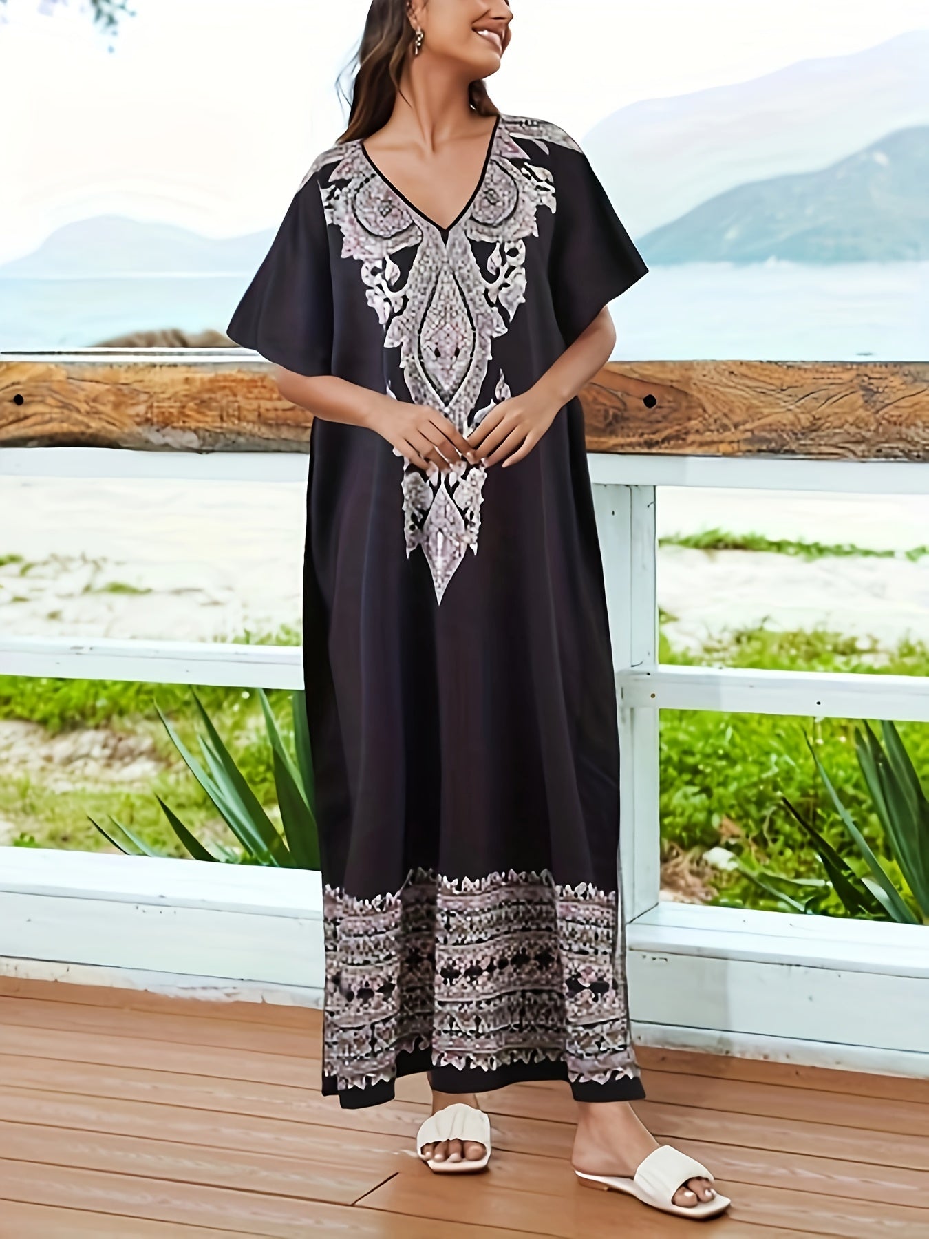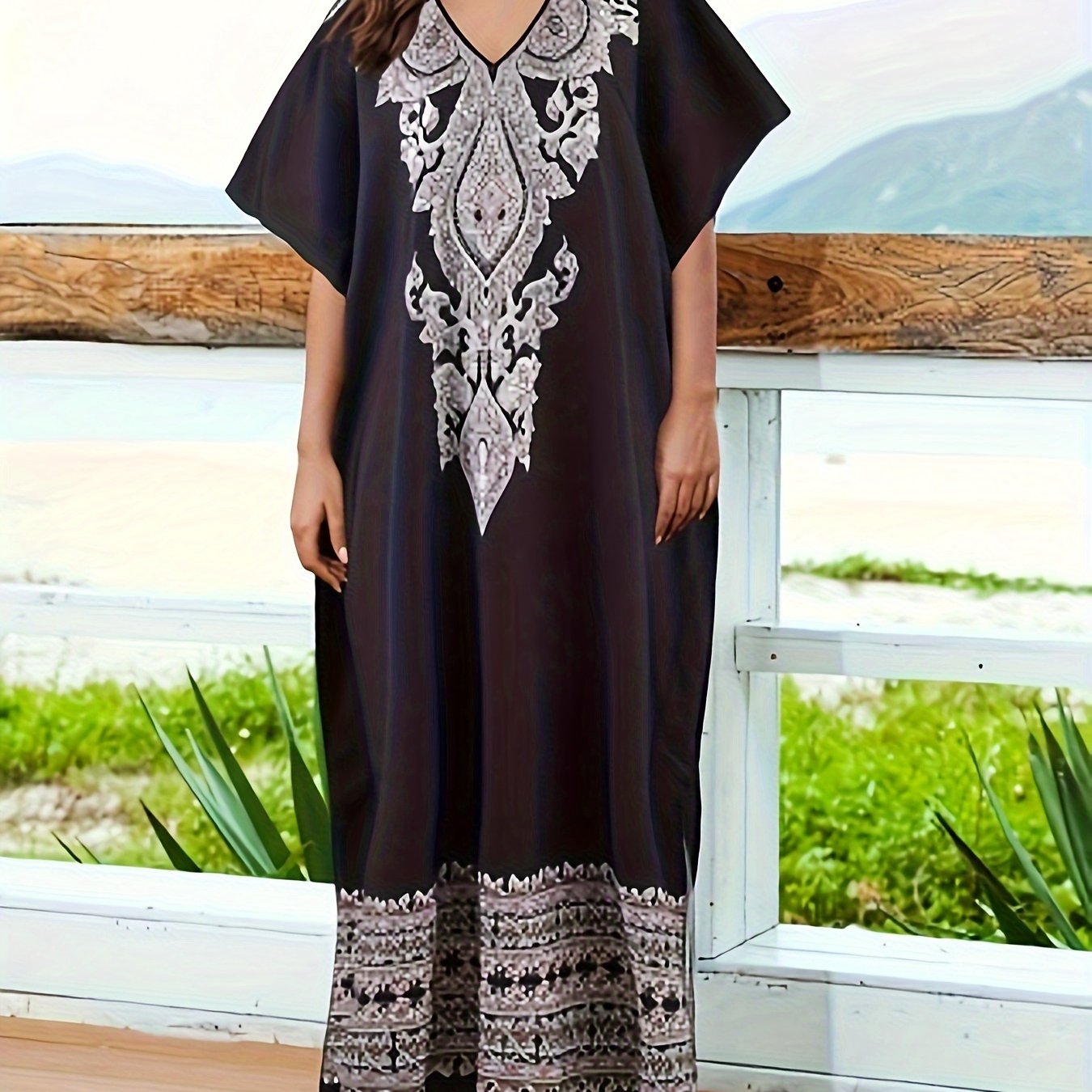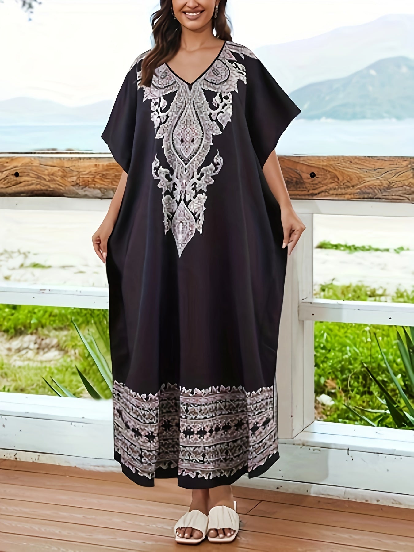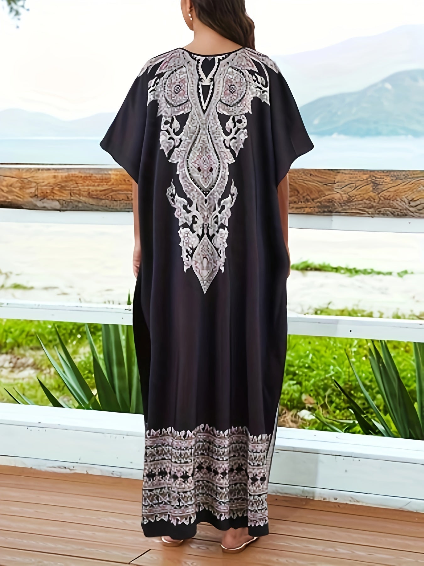 Discover the elegance of the Women's Bohemian Floral Abaya Kaftan, designed with a chic V-Neck and stylish batwing sleeves. This long-length kaftan, made from 95% polyester, combines comfort and fashion, perfect for all seasons.