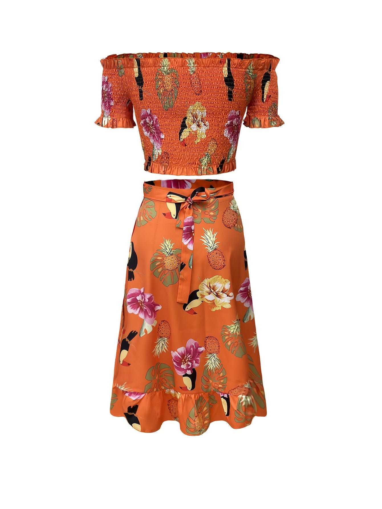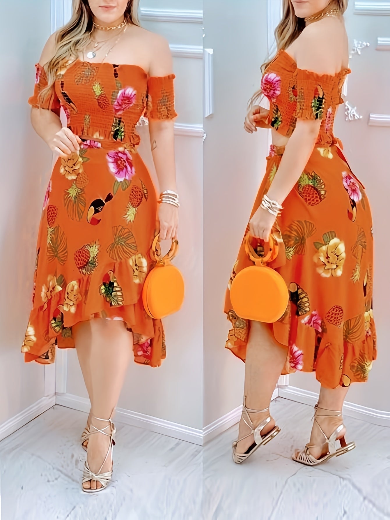 Elevate your spring wardrobe with this stunning Women's Off-the-Shoulder Mushroom Top & Skirt Set. Its unique tropical print brings vibrancy to your ensemble, while the elegant silhouette ensures you'll turn heads. Ideal for garden parties, brunches, or leisurely strolls, this set is a must-have for the modern woman's closet. Don't miss out on this chic addition that perfectly combines style and comfort!