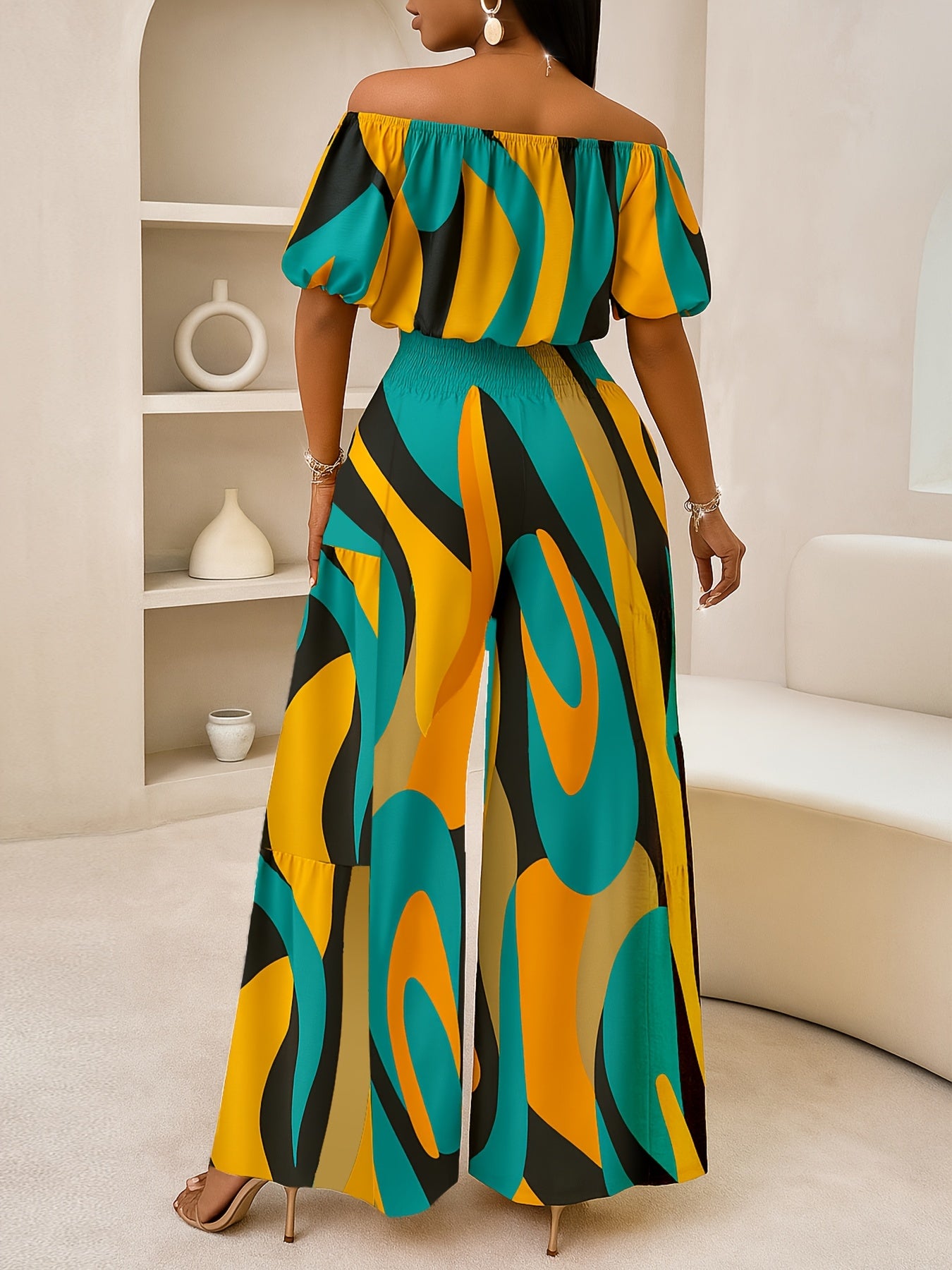 Women's Tropical Print Off-Shoulder Crop Top & Wide-Leg Pants Set