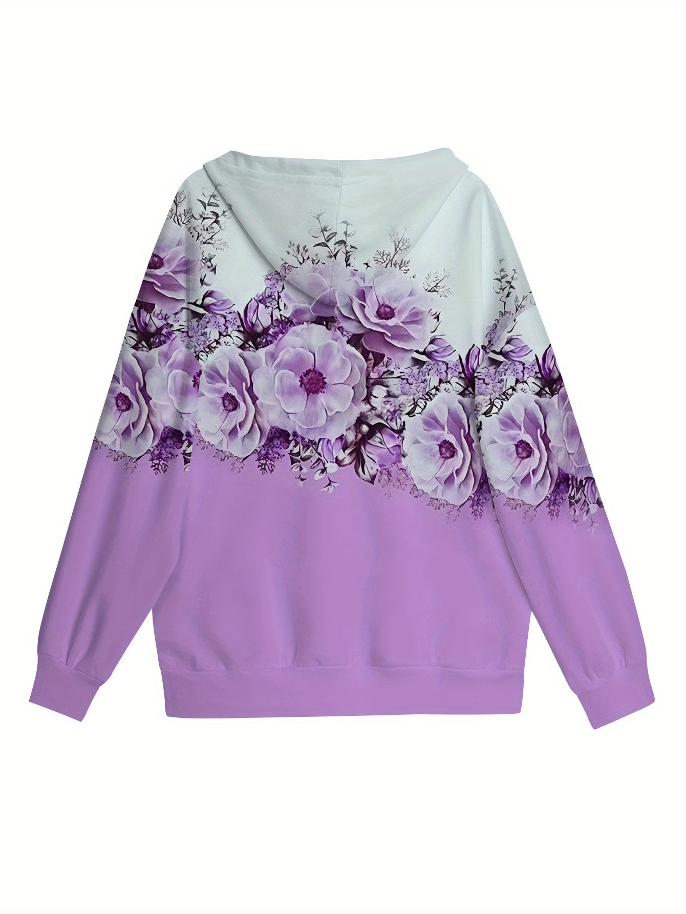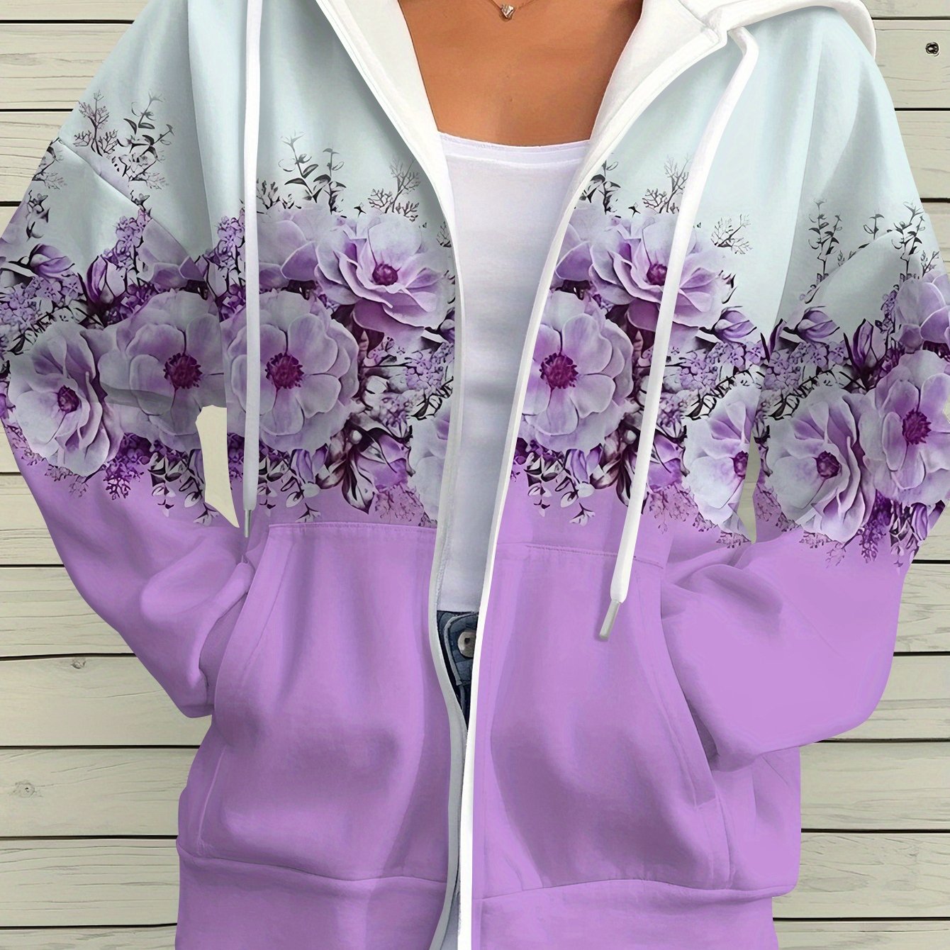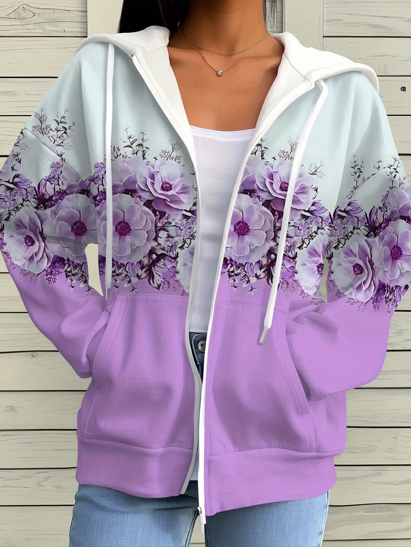 Elevate your winter wardrobe with our Women's Stylish Floral Print Zip-Up Hoodie Jacket. This cozy fall and winter essential features a vibrant purple and white flower design that adds a touch of elegance to your casual outings. Crafted from 100% polyester, it's designed for both comfort and style.